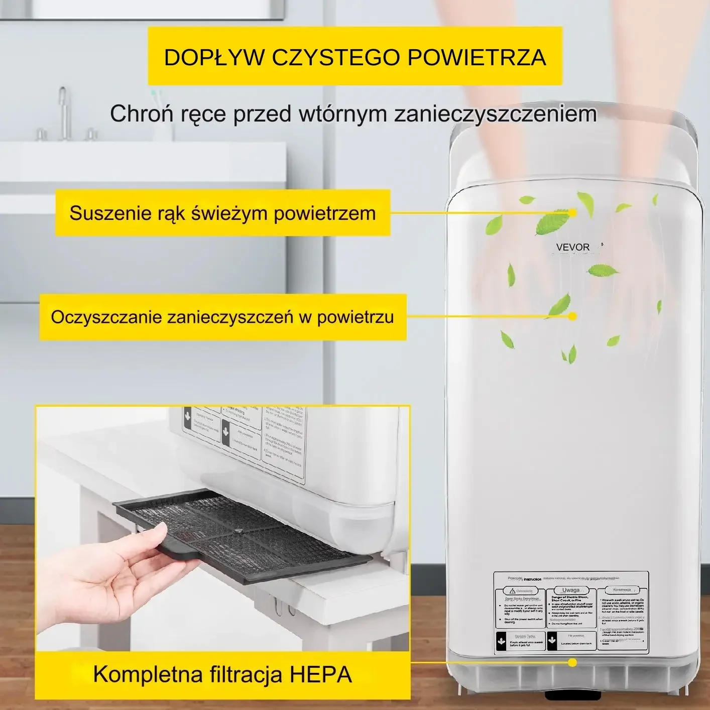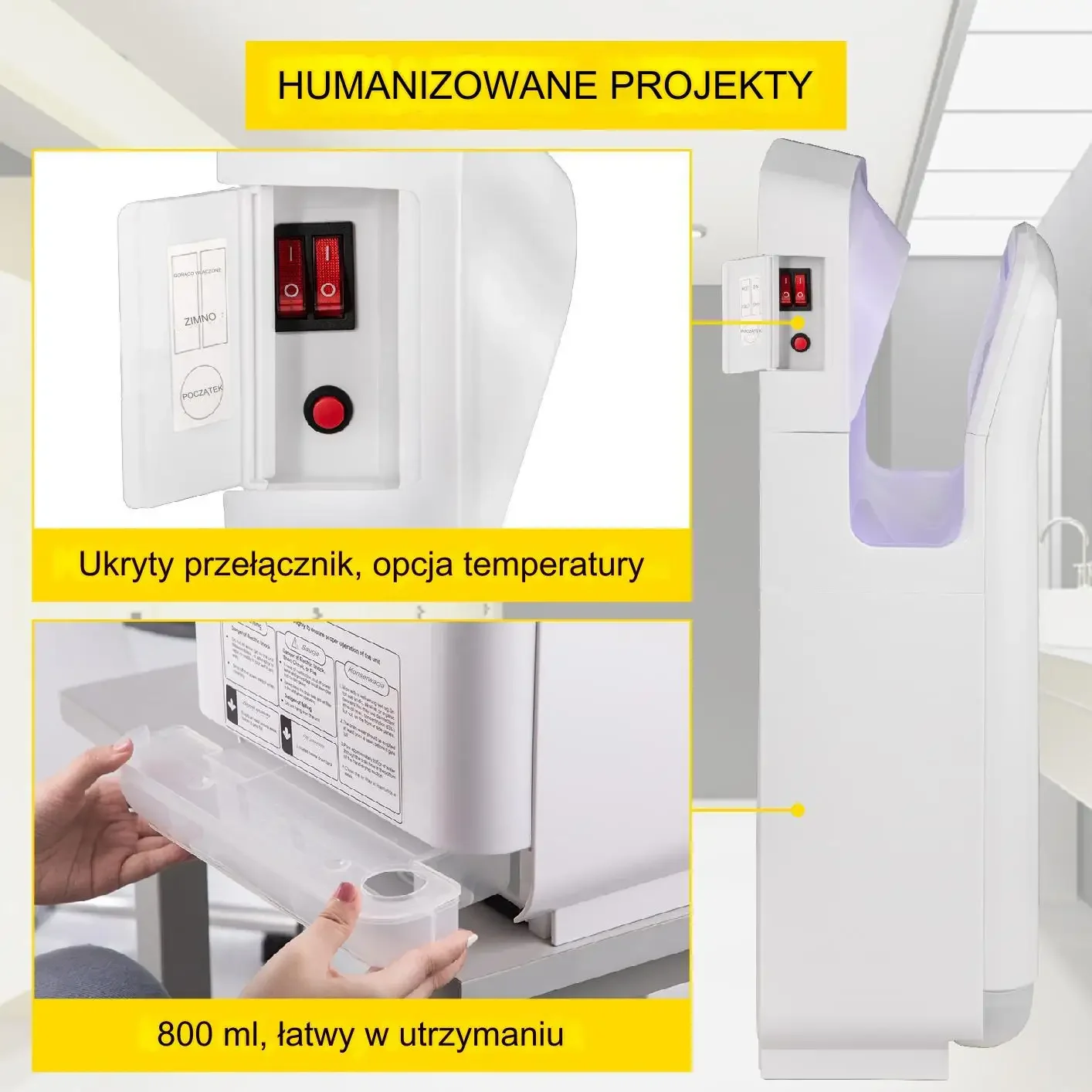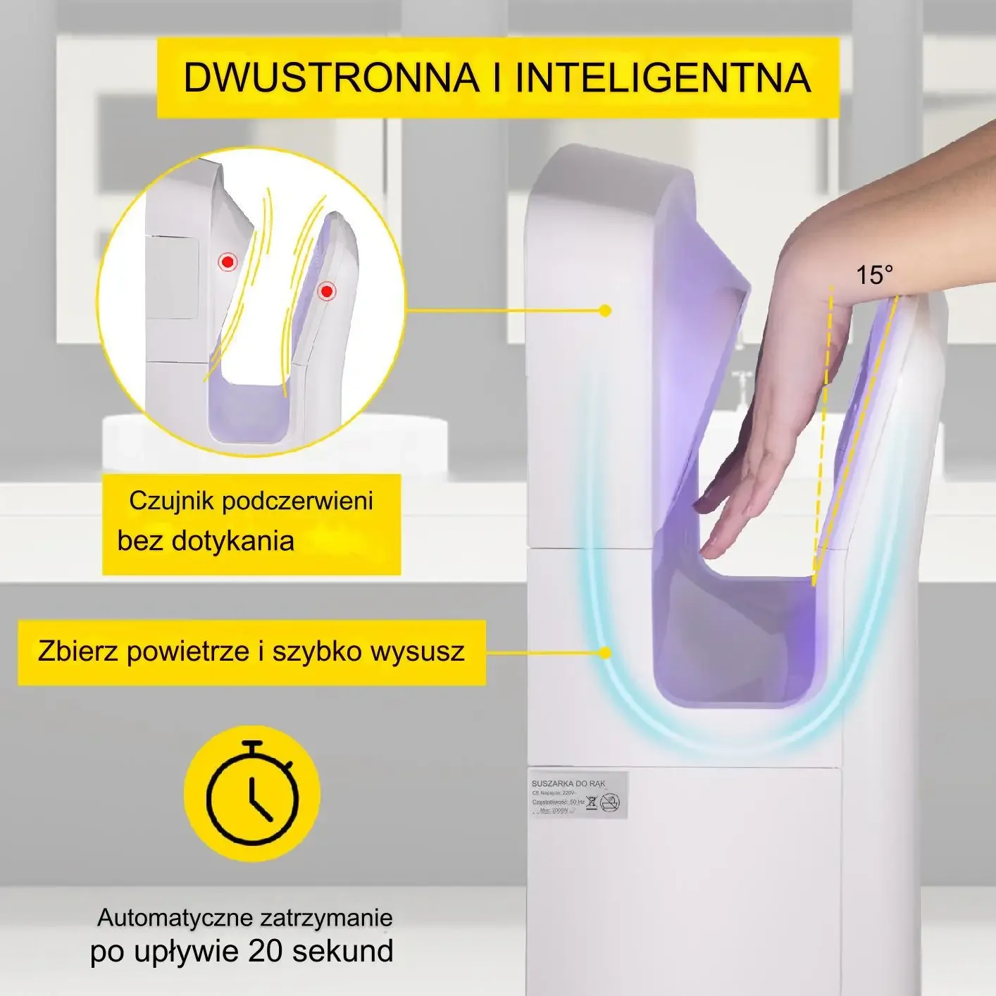 Nowoczesna elektryczna suszarka do rąk o mocy 2000W, wyposażona w system szybkiego suszenia i filtrację HEPA. Dzięki silnikowi o prędkości 23000 obr./min, suszenie rąk trwa zaledwie 8-10 sekund. Bezdotykowa obsługa, solidna obudowa z ABS oraz możliwość ustawienia temperatury powietrza sprawiają, że jest to idealne rozwiązanie dla miejsc publicznych i komercyjnych.