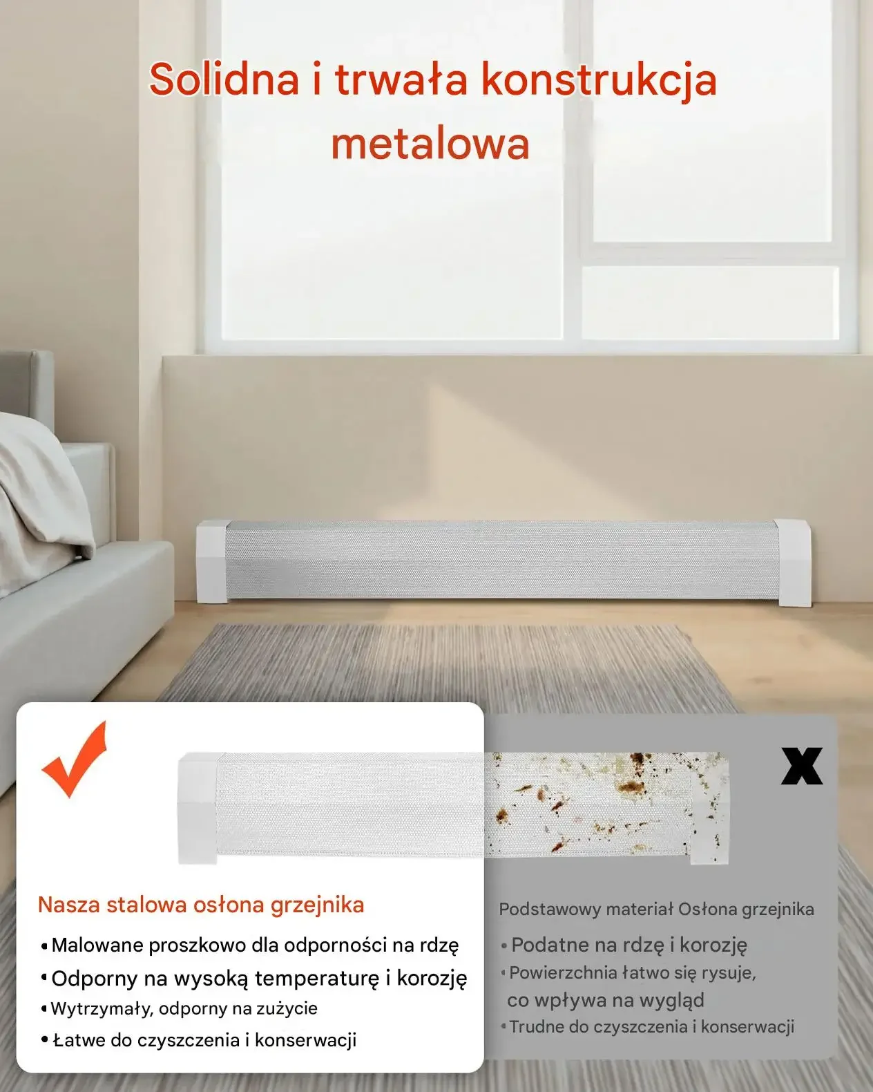 - ✅ Długotrwała ochrona grzejnika: wytrzymała osłona chroni elementy grzewcze przed uszkodzeniami mechanicznymi i zabrudzeniami, zapewniając wieloletnią, stabilną pracę instalacji