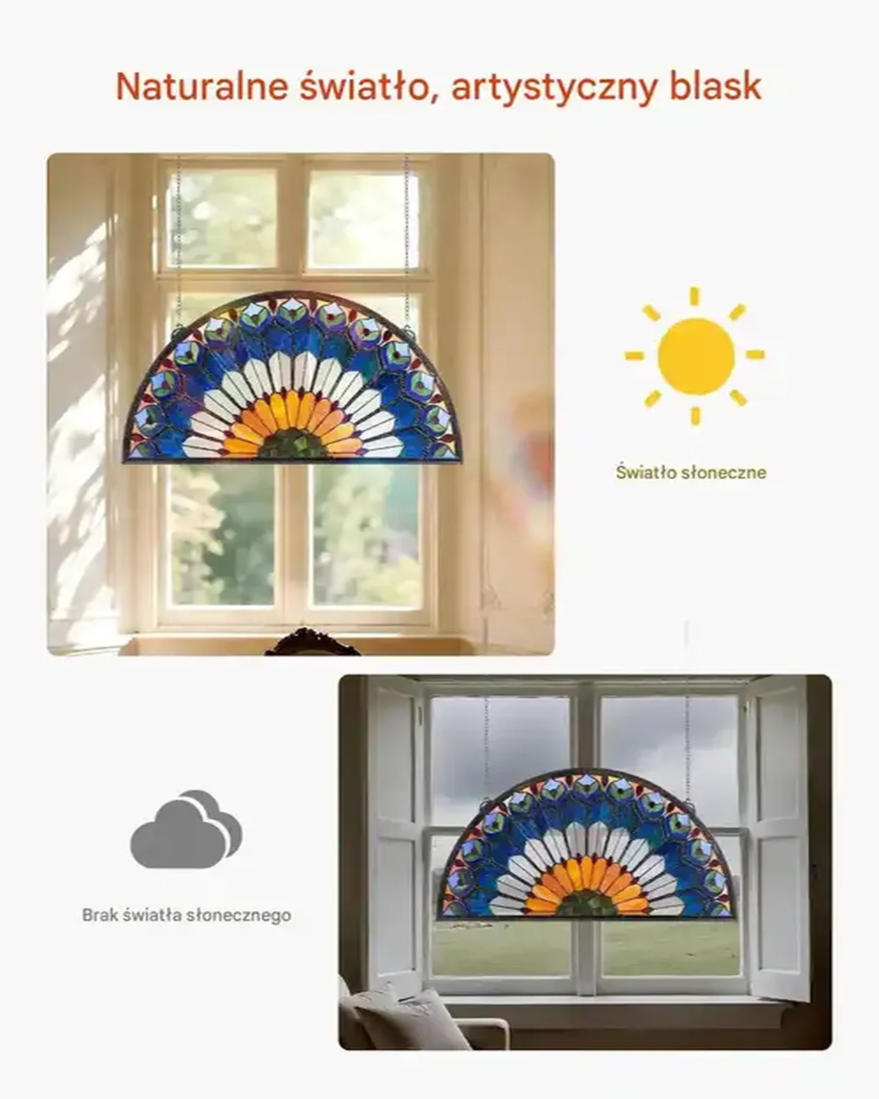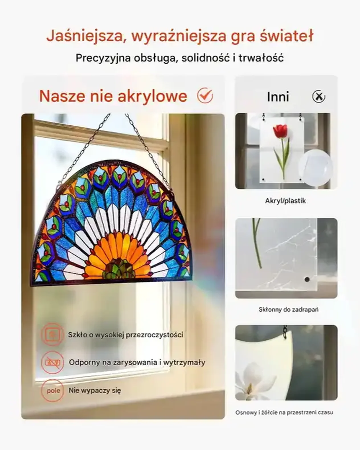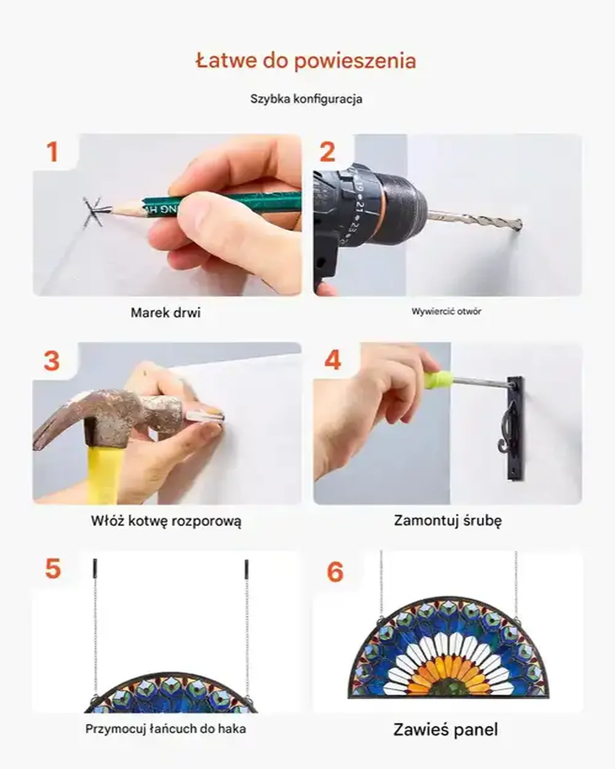 • Gotowy do zawieszenia: Panel witrażowy dostarczany jest z przygotowanym łańcuchem i hakami, co ułatwia łatwe zawieszanie na dowolnej powierzchni.