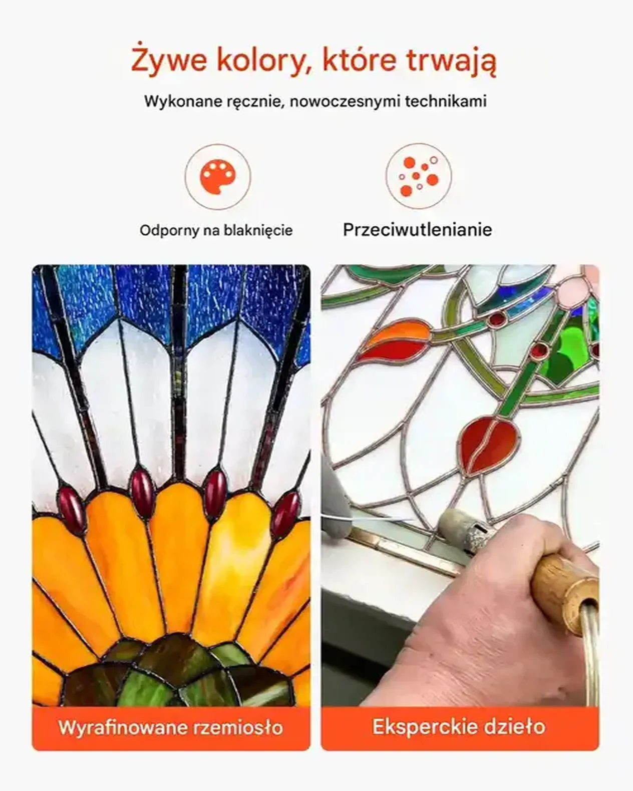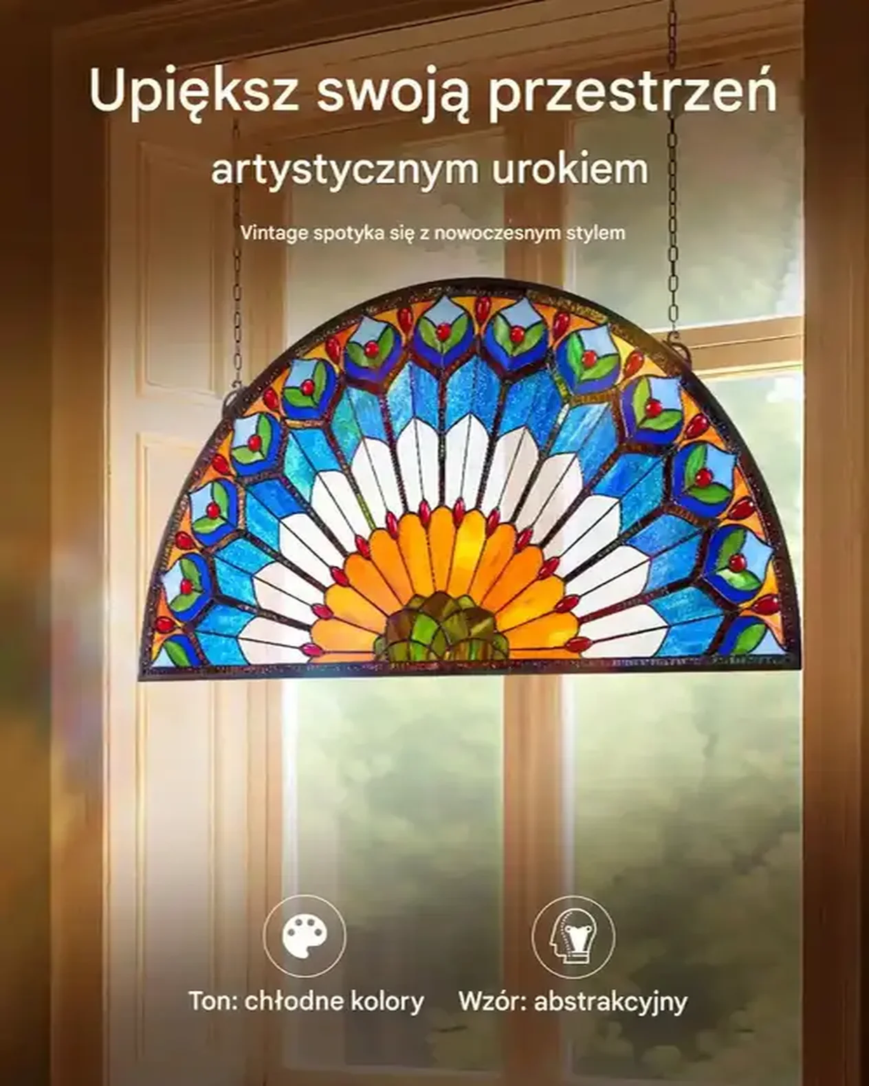 • Artystyczny design: Każdy panel witrażowy charakteryzuje się skomplikowanymi wzorami oraz wibrującymi kolorami, łącząc luksus amerykański z nowoczesnym minimalizmem.