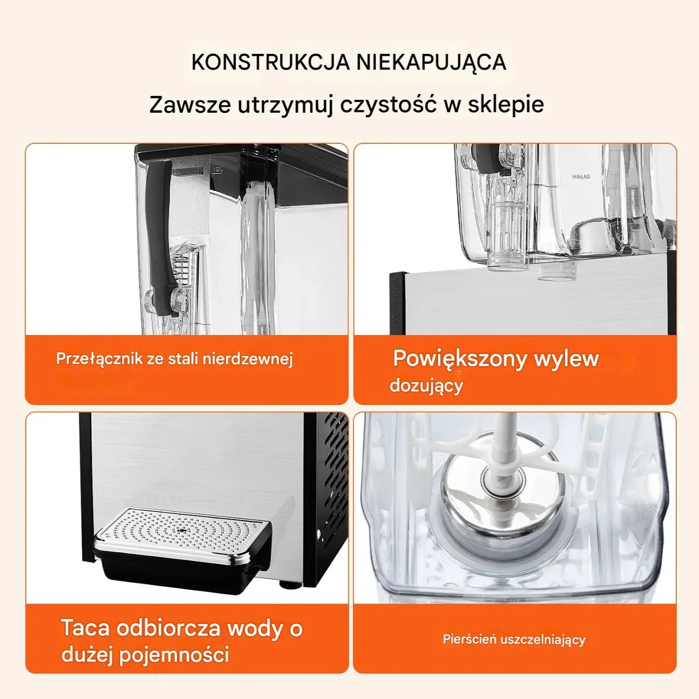 - ✅ Szeroki kranik dozujący: Umożliwia łatwe nalewanie napojów z drobnymi cząstkami, np. soków z miąższem czy kokosa