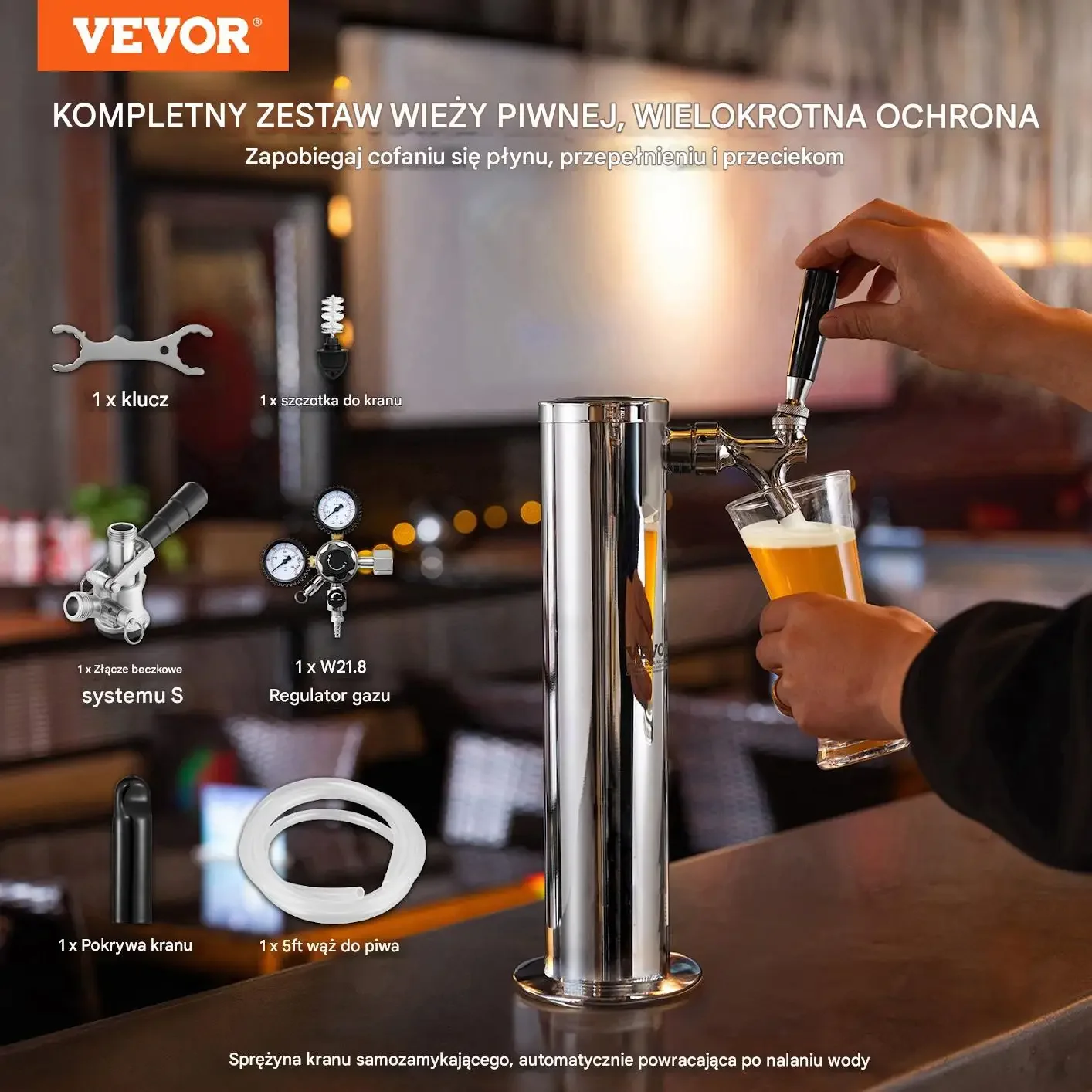 Kompletny zestaw wieży piwnej z wielofunkcyjną ochroną, zapobiegający cofaniu się płynu i przeciekowi. Zestaw obejmuje zestaw bezkluczowy, reduktor gazu, złączkę beczkową systemu A, pokrywę kranu oraz wąż do piwa o długości 5 stóp. Sprężyna kranu samozamykającego i automatycznie powracająca po nalaniu wody zapewniają wygodę użytkowania.