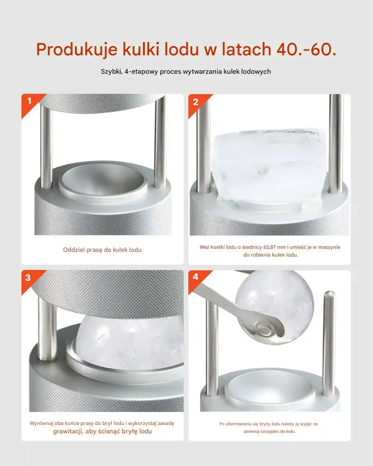 - ✅ Szybka produkcja lodu: Wykorzystuje grawitację i przewodnictwo ciepła metalu do formowania kul lodu w 40-60 sekund.
