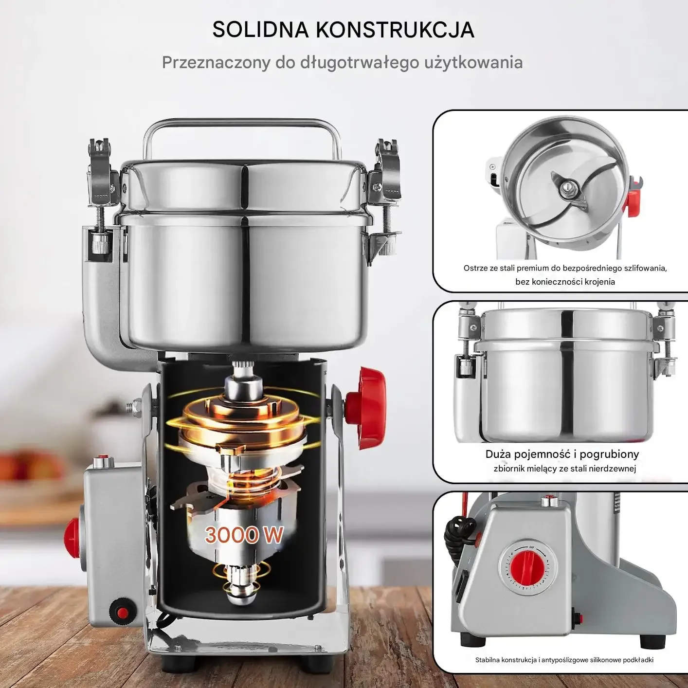 - Moc i precyzja: 3000W i 28000 obr./min gwarantują szybkie i dokładne mielenie.