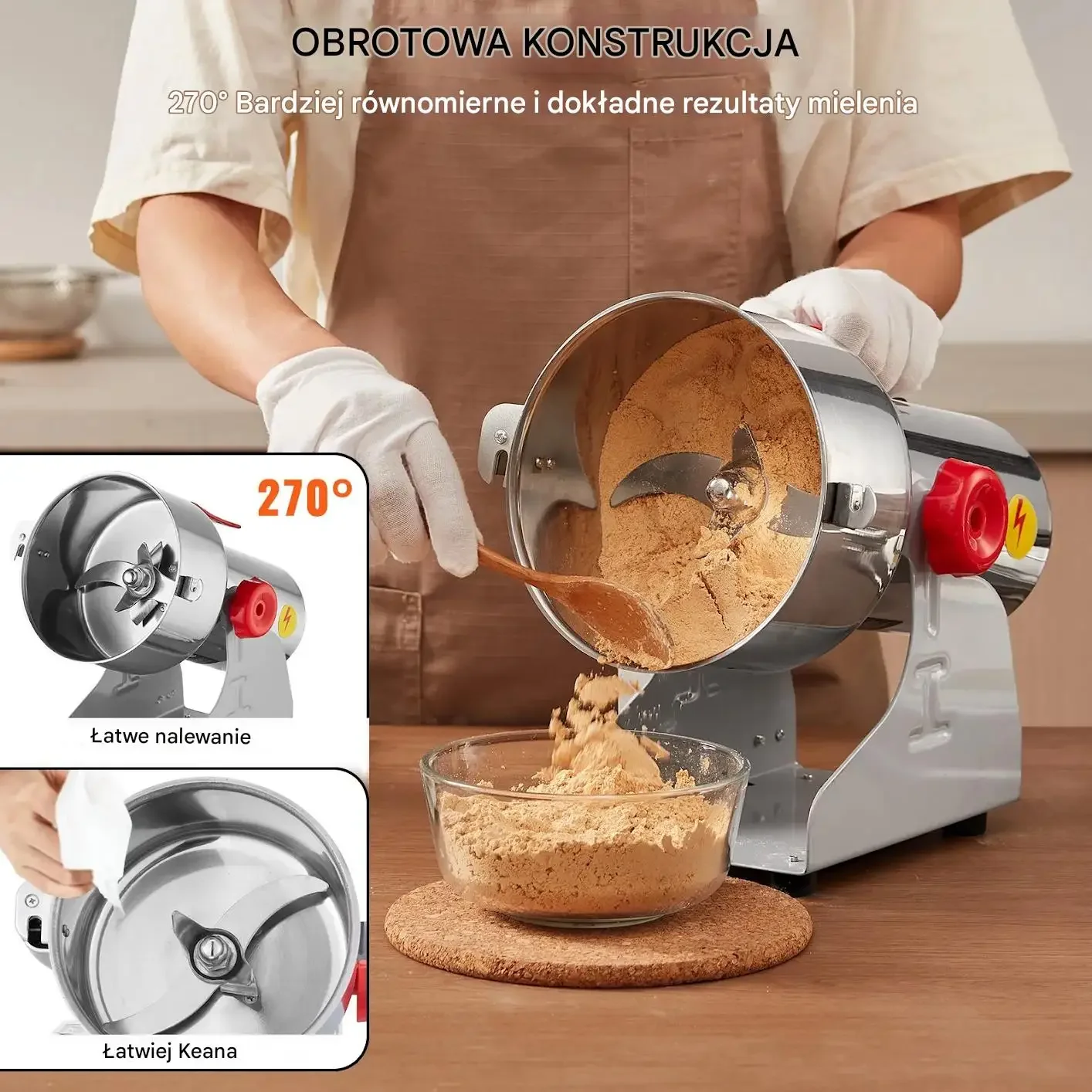 - ✅ Konstrukcja obrotowa: Możliwość obracania korpusu o 270° ułatwia wylewanie proszku i zapewnia dokładniejsze mielenie.