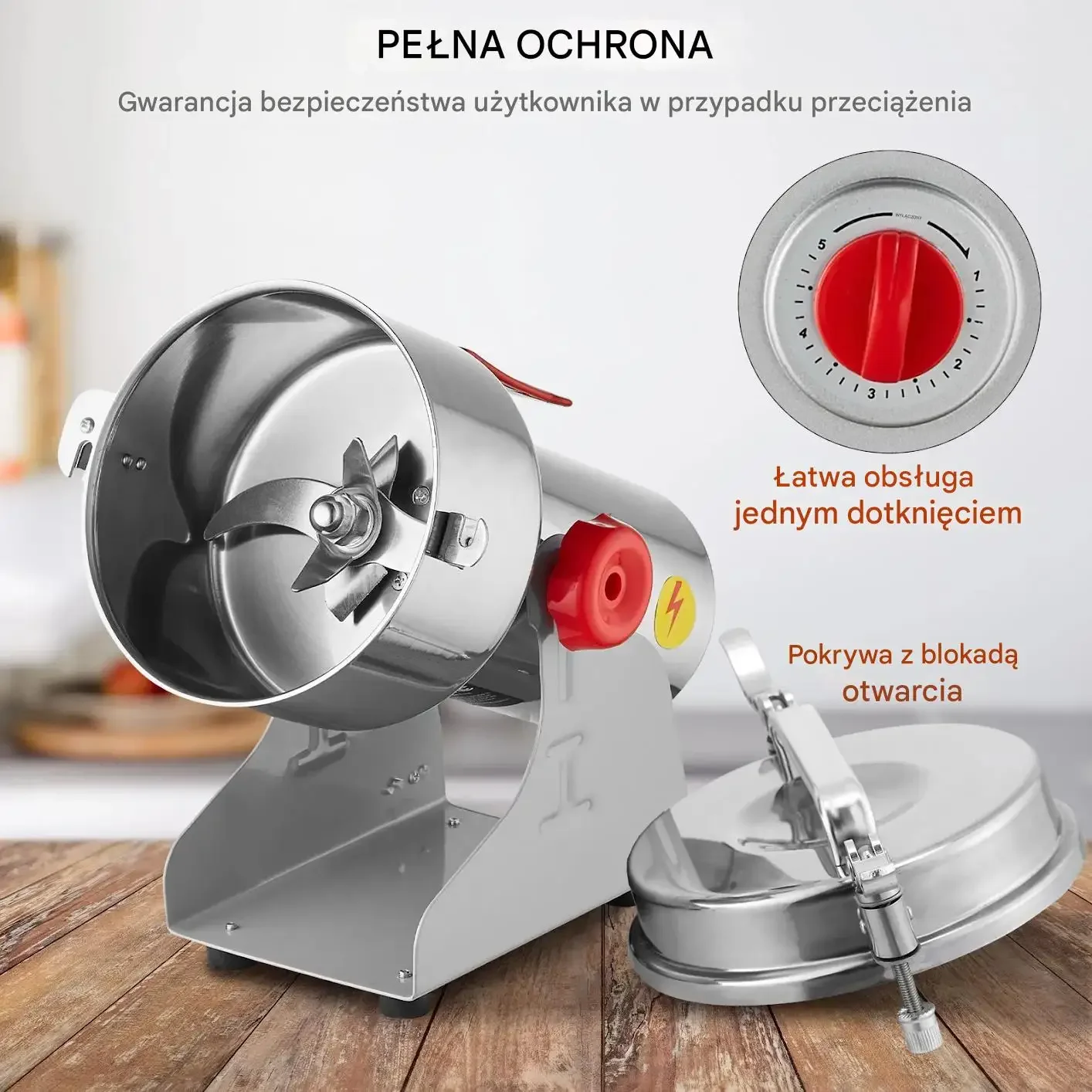 - ✅ Automatyczne zatrzymanie: Młynek automatycznie zatrzymuje się po otwarciu pokrywy, chroniąc użytkownika przed obrażeniami.