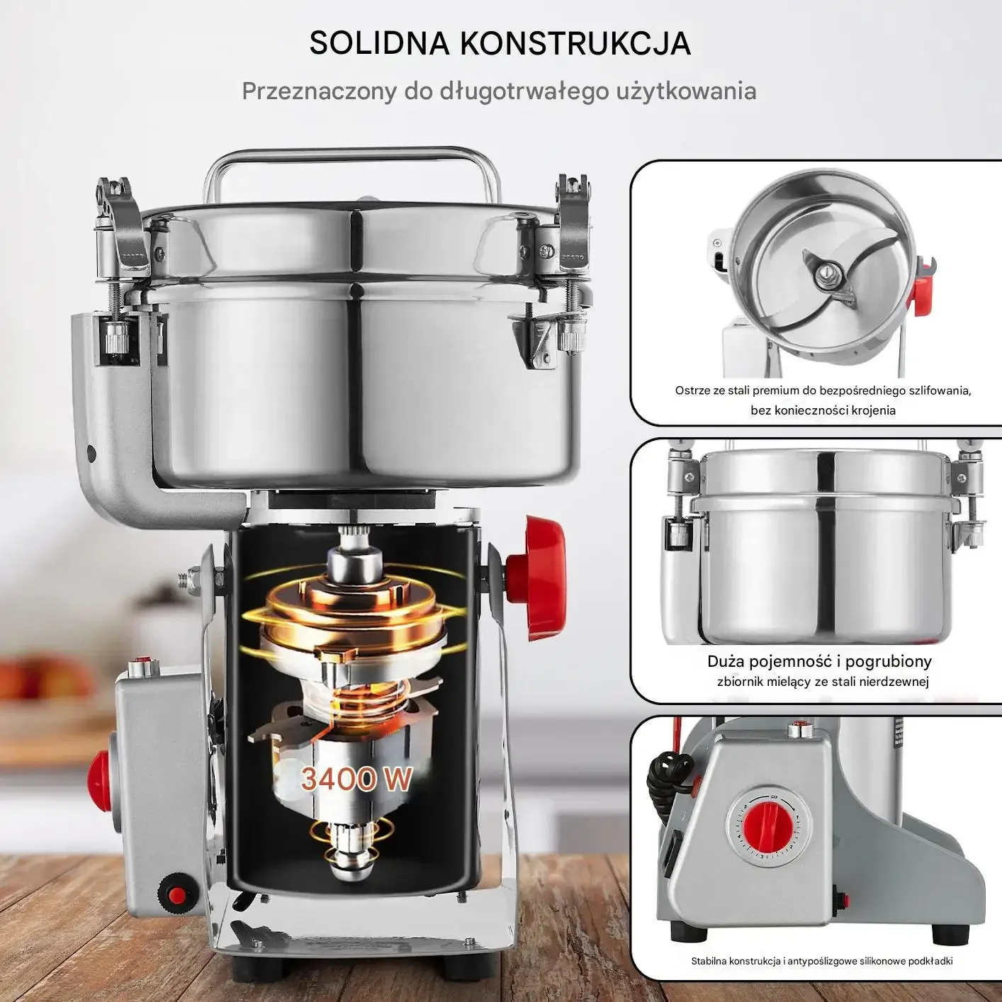 Solidna konstrukcja młynka została zaprojektowana do długotrwałego użytkowania. Ostrza ze stali premium służą do bezpośredniego szlifowania, bez konieczności krojenia. Młynek posiada dużą pojemność oraz pogrubiony zbiornik mielący ze stali nierdzewnej. Całość spoczywa na stabilnej konstrukcji z antypoślizgowymi silikonowymi podkładkami, co zapewnia bezpieczeństwo i komfort użytkowania. Moc urządzenia wynosi 3400W.
