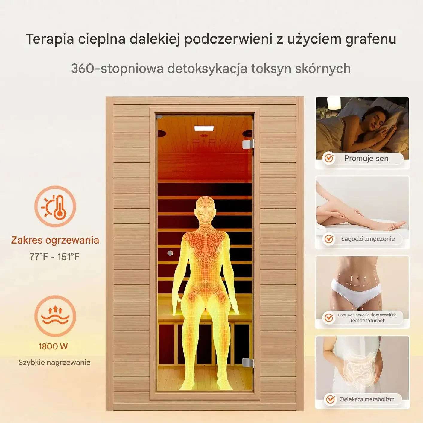 • Bezpieczne spalanie tłuszczu: Mocny system grzewczy 1800 W zapewnia szybkie nagrzewanie oraz szeroki zakres temperatur 25–66°C, wspierając efektywne spalanie kalorii bez intensywnego wysiłku.