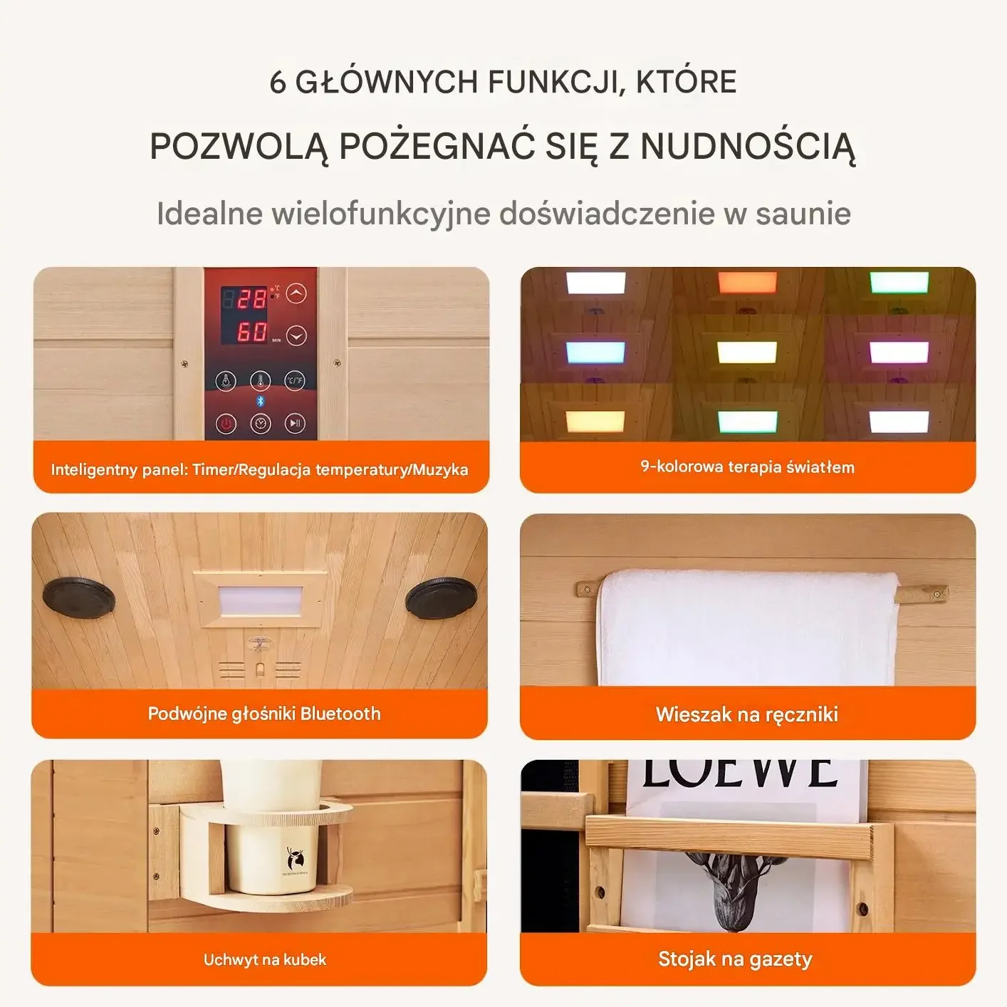 • Dodatkowy wieszak na ubrania: Praktyczny wieszak na ręczniki i odzież wewnątrz sauny ułatwia utrzymanie porządku.