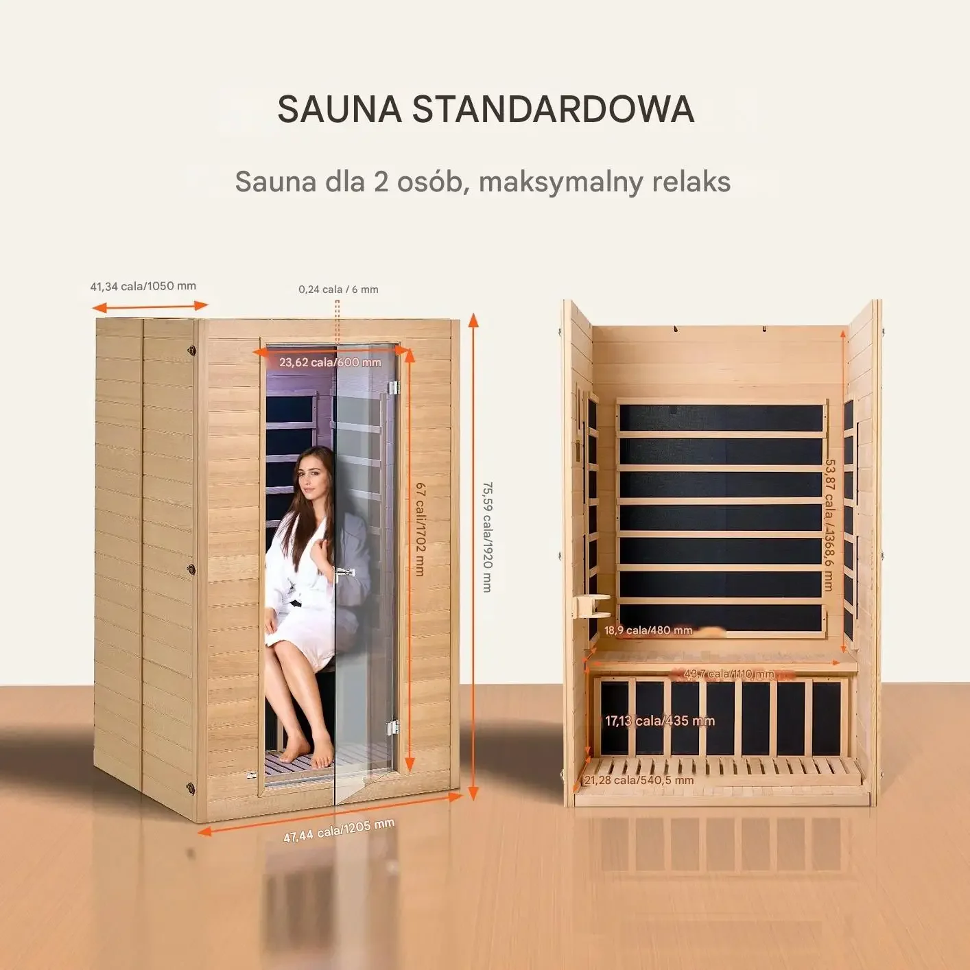 • Kompaktowe wymiary do mieszkań: Wymiary około 1205 x 1050 x 1920 mm sprawiają, że sauna idealnie sprawdza się w salonie, sypialni, łazience, piwnicy czy domowej siłowni.