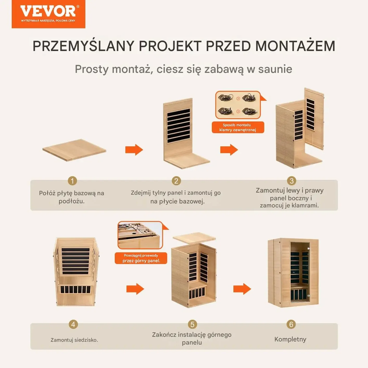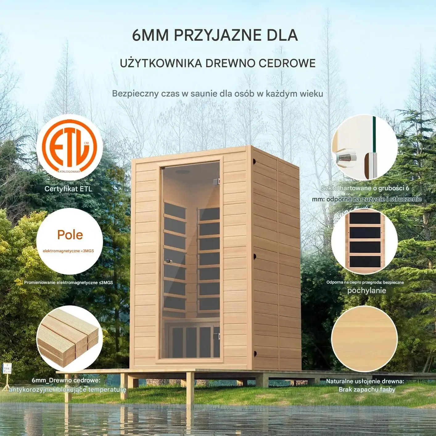 • Naturalne drewno jodłowe: Ściany wykonane z naturalnej jodły kanadyjskiej (hemlock) o grubości 6 mm zapewniają trwałość, naturalny zapach i elegancki wygląd wnętrza.