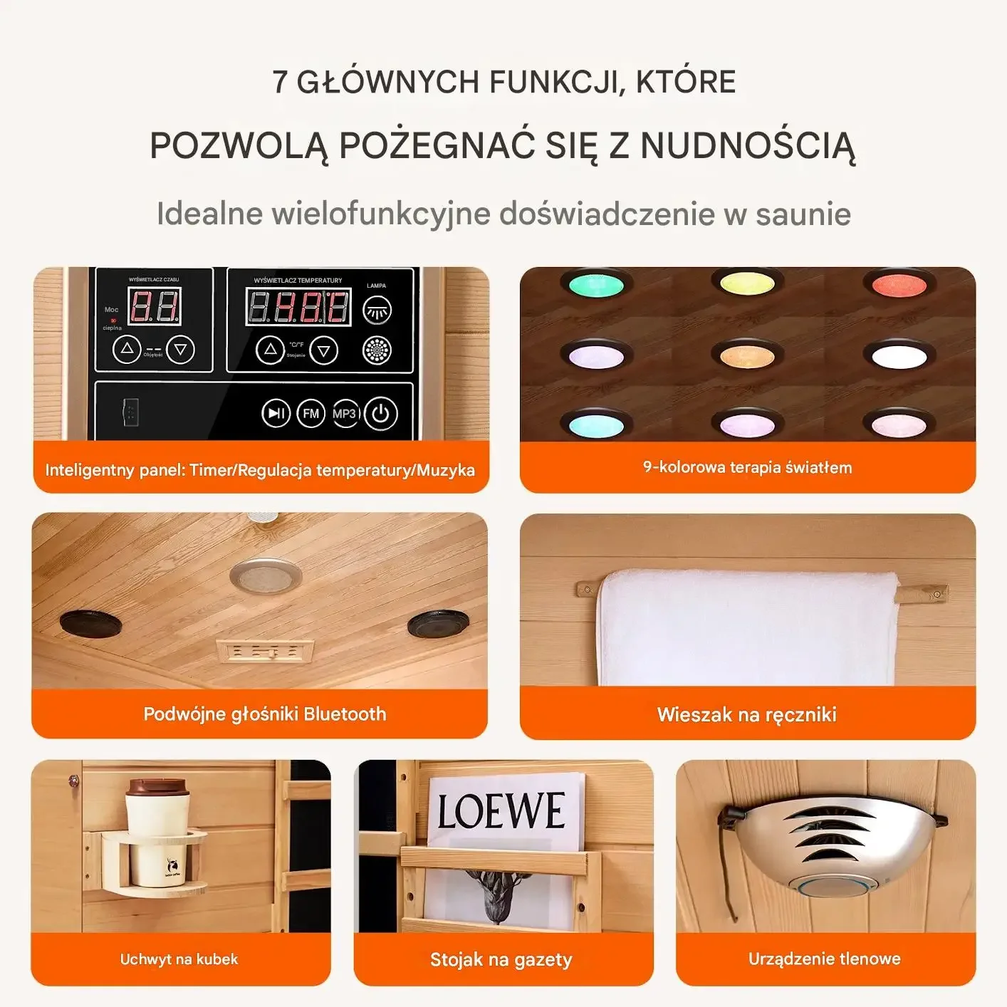 7 głównych funkcji, które pozwolą pożegnać się z nudnością – idealne wielofunkcyjne doświadczenie w saunie. Inteligentny panel: timer, regulacja temperatury, muzyka. 9-kolorowa terapia światłem. Podwójne głośniki Bluetooth. Wieszak na ręczniki. Uchwyt na kubek. Stojak na gazety. Urządzenie tlenowe.