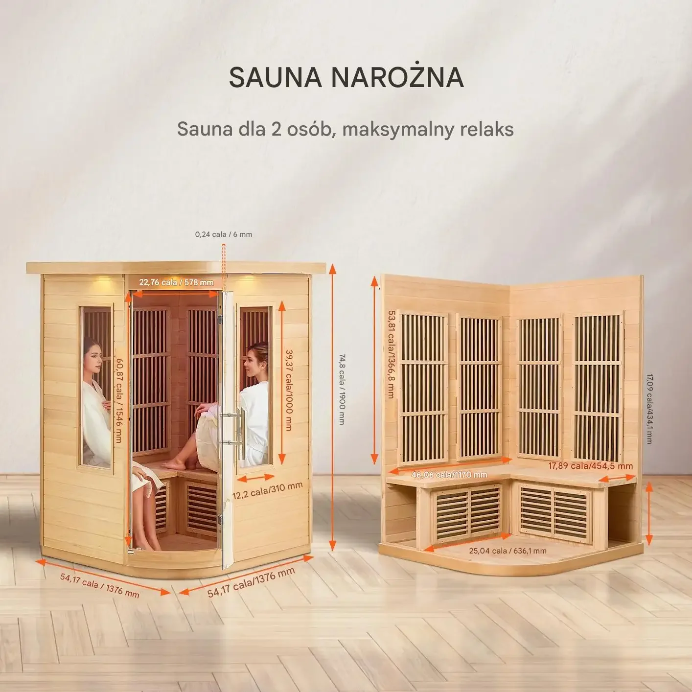 Sauna narożna – sauna dla 2 osób, maksymalny relaks. Wymiary zewnętrzne: szerokość frontu 137,6 cm (54,17 cala), głębokość 137,6 cm (54,17 cala), wysokość 190 cm (74,8 cala). Wymiary drzwi: wysokość 154,9 cm (60,97 cala), szerokość 57,8 cm (22,76 cala), grubość szkła 0,6 cm (0,24 cala). Wewnętrzne wymiary siedziska: głębokość 31 cm (12,2 cala), długość 63,61 cm (25,04 cala). Wymiary paneli bocznych: wysokość 172,9 cm (67,99 cala) i 176,58 cm (69,53 cala), szerokość odpowiednio 121,92 cm (48,06 cala) i 45,54 cm (17,89 cala).