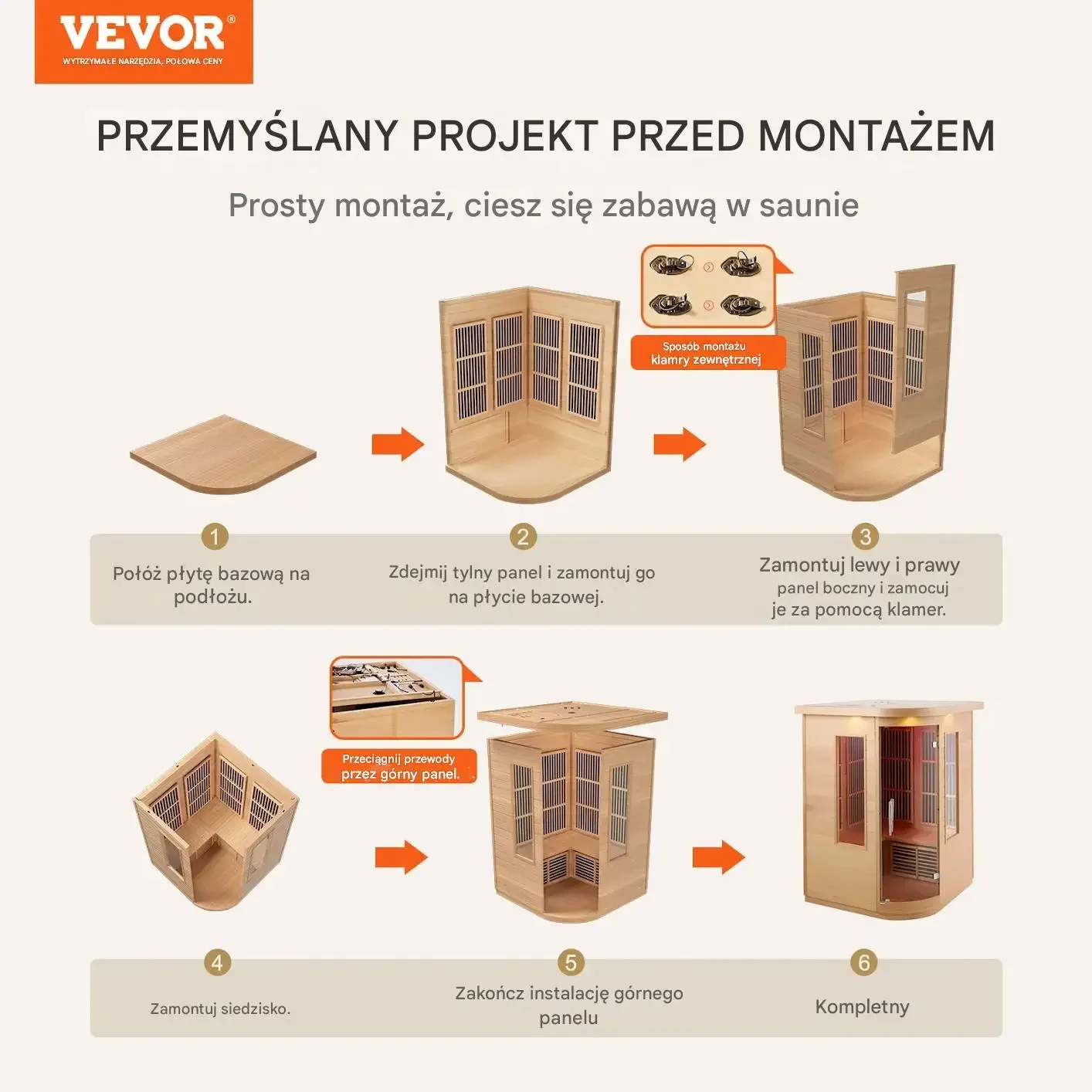 - ✅ Wstępnie zmontowana konstrukcja: elementy sauny są wstępnie złożone, dzięki czemu końcowy montaż wymaga jedynie prostego złożenia modułów. Czytelna instrukcja instalacji i schemat okablowania eliminują kłopotliwe dopasowywanie śrub i skomplikowane prace stolarskie