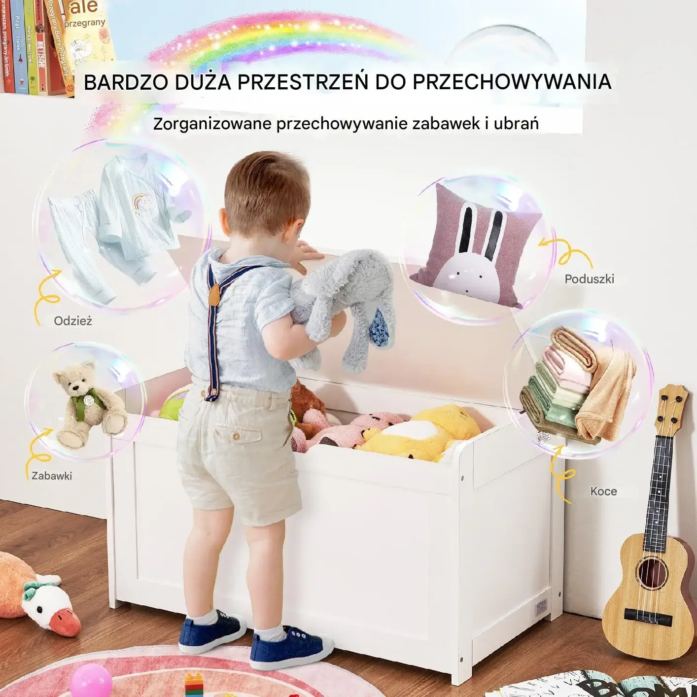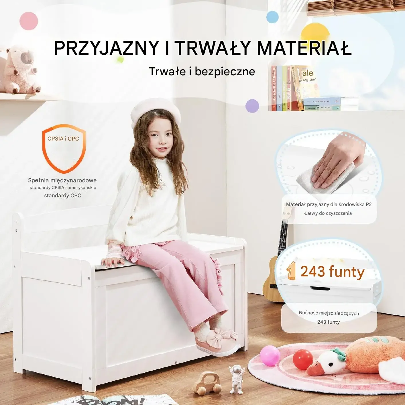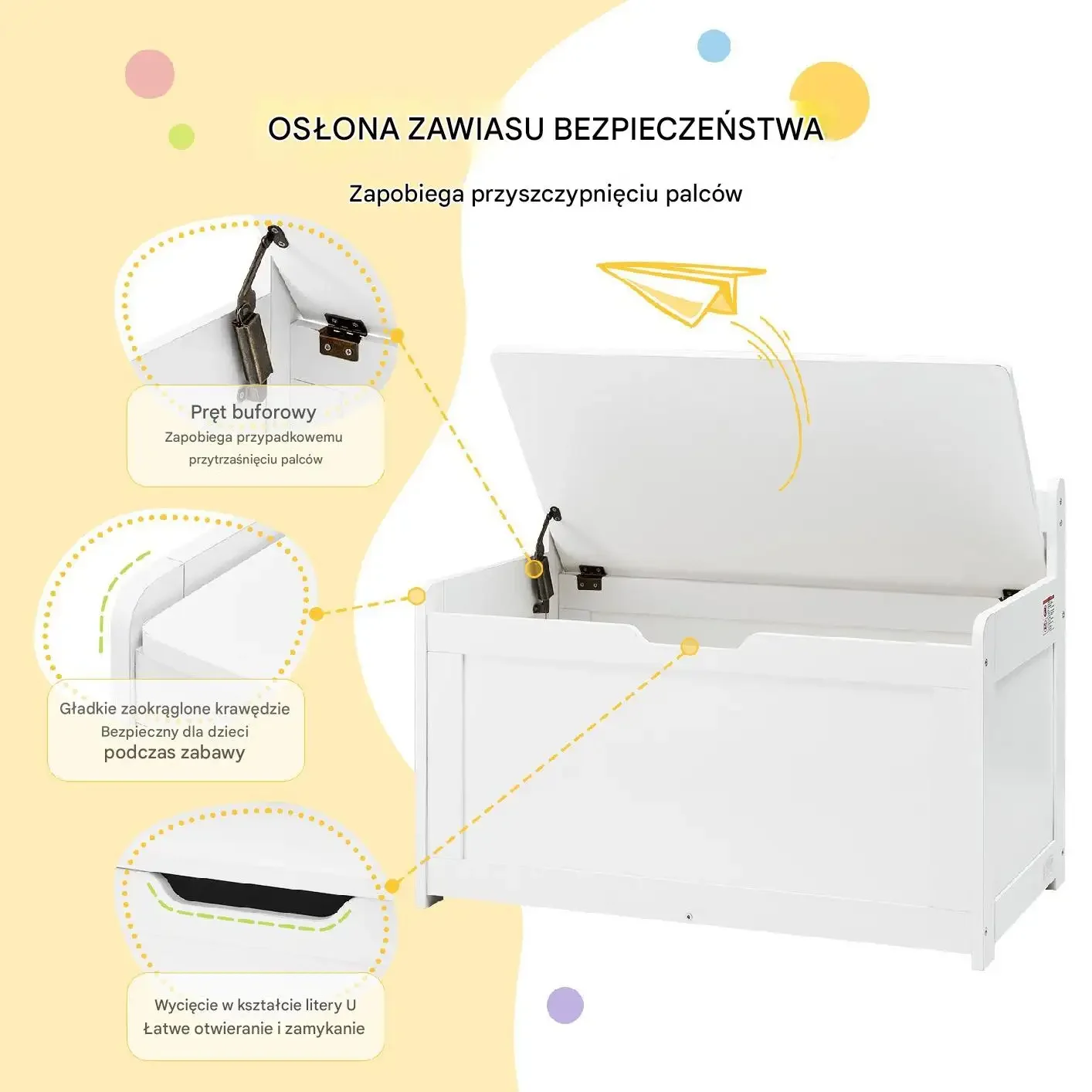 Osłona zawiasu bezpieczeństwa — zapobiega przytrzaśnięciu palców. Mebel z dużą przestrzenią do przechowywania — zorganizowane przechowywanie zabawek i ubrań. Przyjazny i trwały materiał — trwałe i bezpieczne. Maksymalne obciążenie siedziska: 243 funty (110,2 kg).