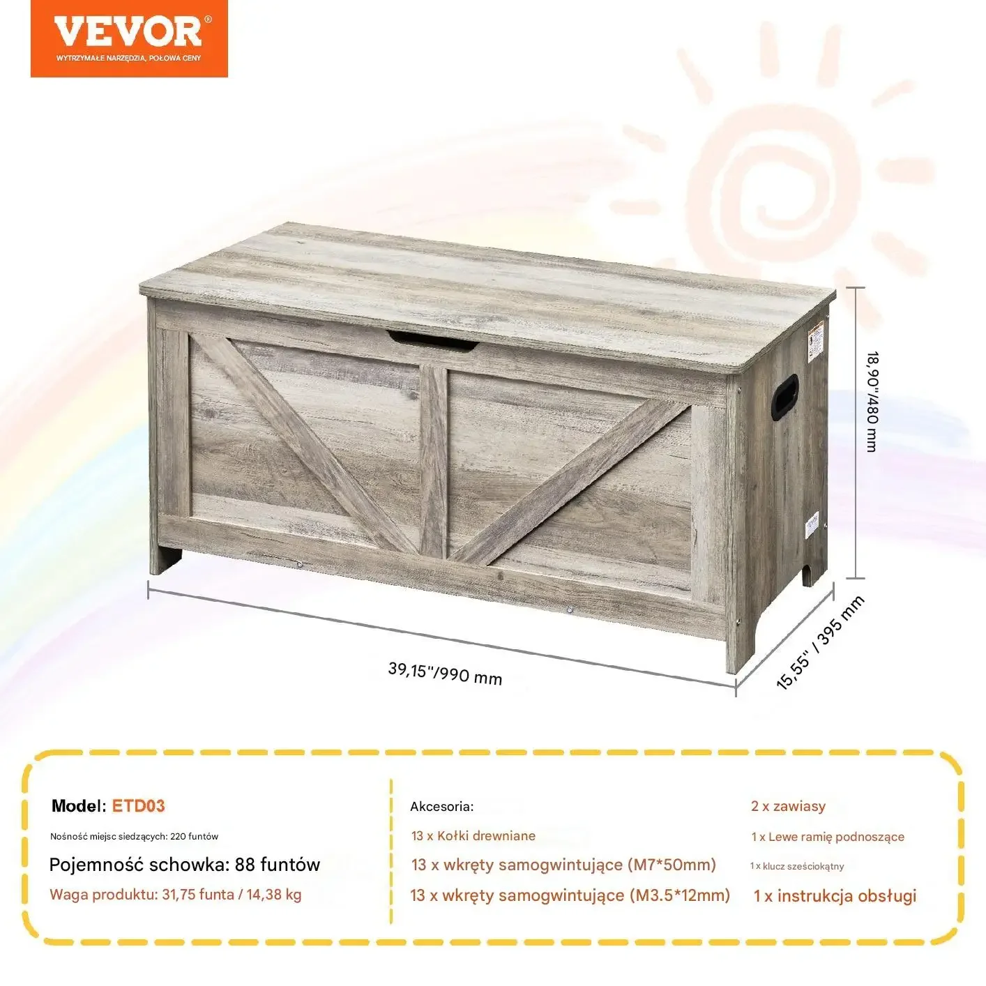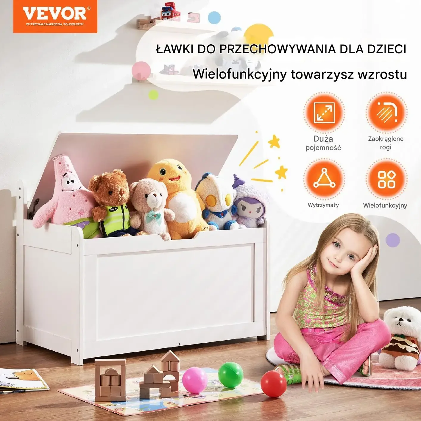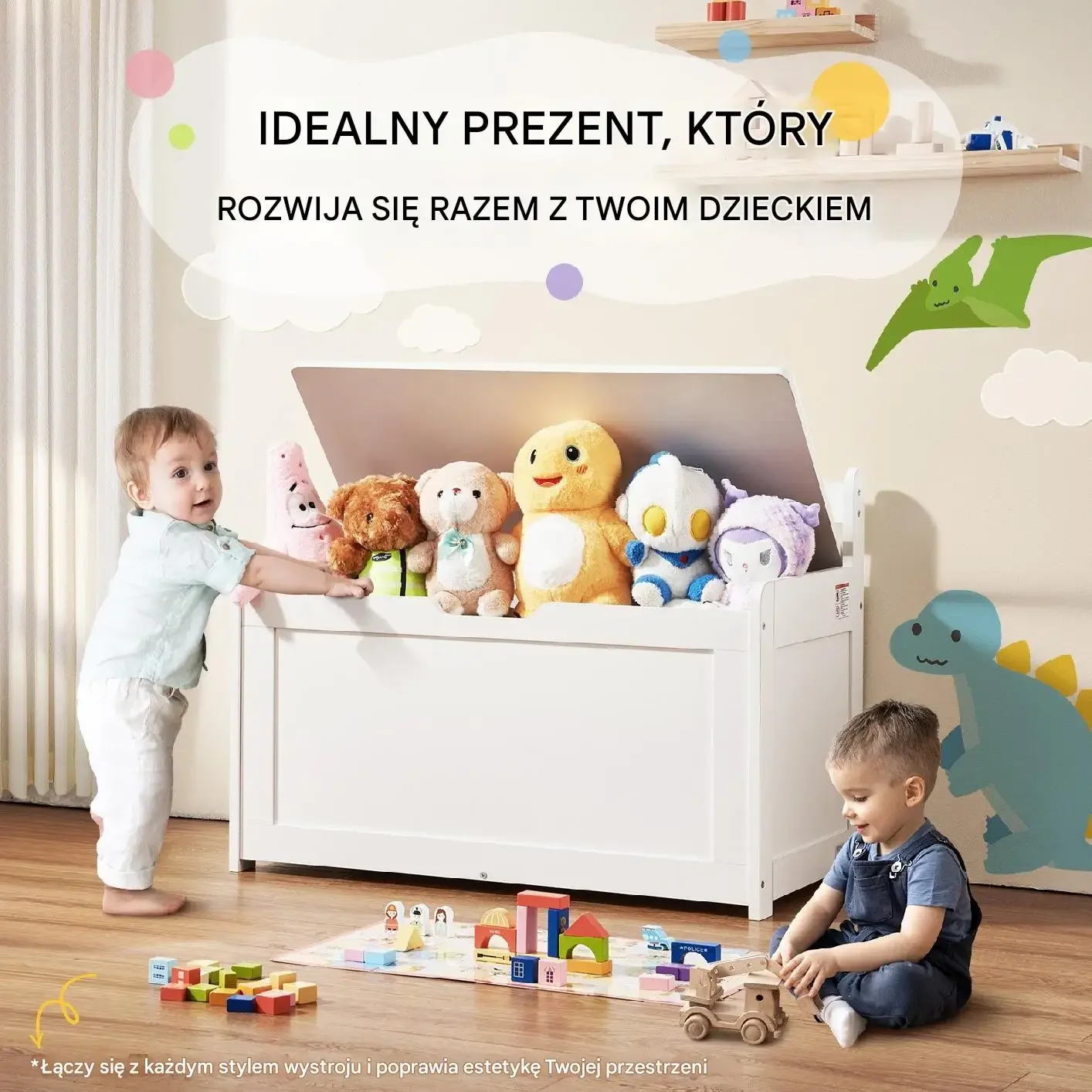 Osłona zawiasu bezpieczeństwa — zapobiega przytrzaśnięciu palców. Mebel z dużą przestrzenią do przechowywania — zorganizowane przechowywanie zabawek i ubrań. Przyjazny i trwały materiał — trwałe i bezpieczne. Maksymalne obciążenie siedziska: 243 funty (110,2 kg).