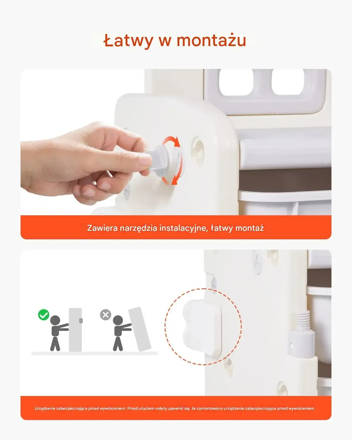 • Zabezpieczenie przed przewróceniem: System mocowania do ściany zapewnia stabilność i bezpieczeństwo.