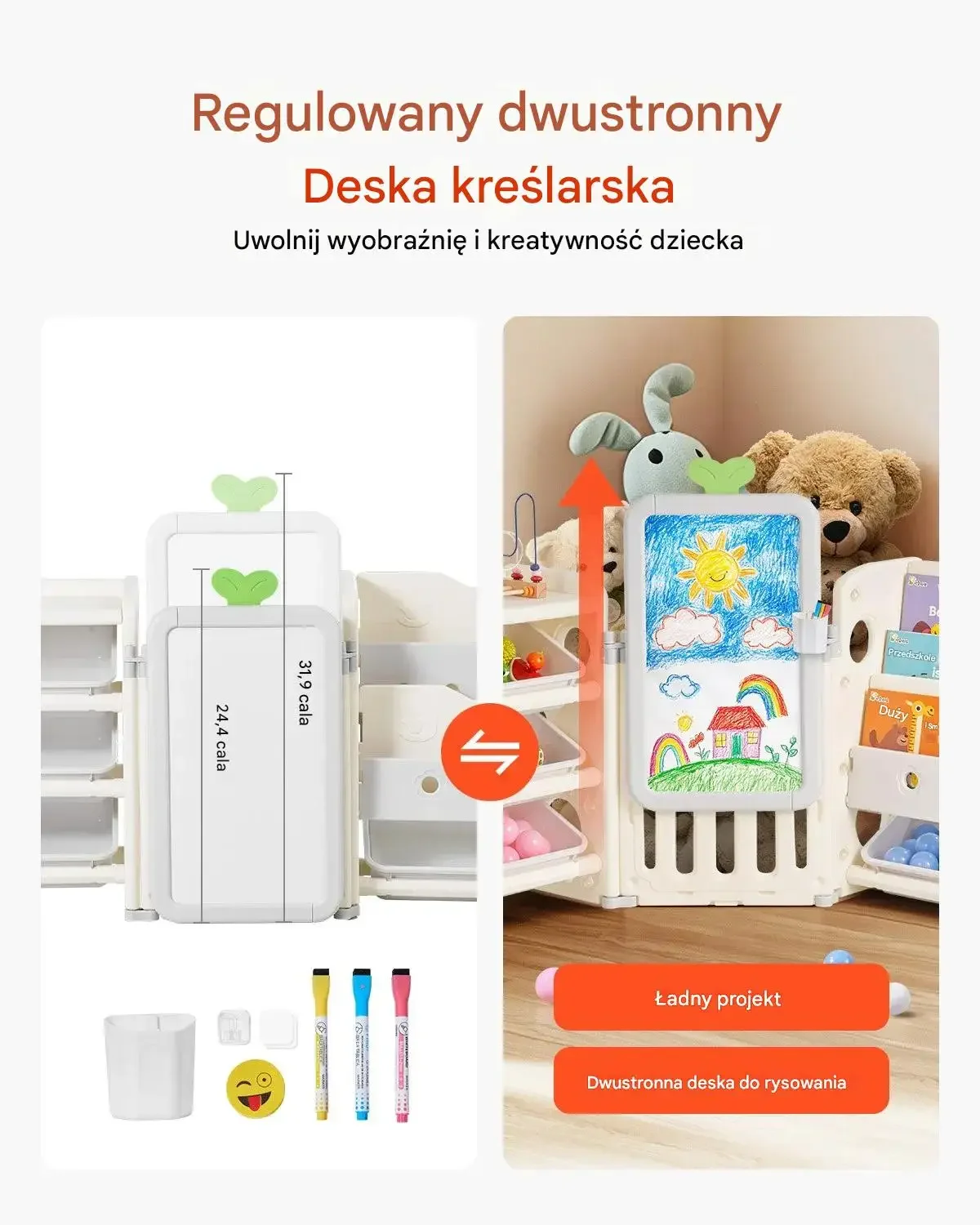Regulowana dwustronna deska kreślarska, o wymiarach 81 cm (31,9 cala) wysokości i 62 cm (24,4 cala) szerokości, pozwala uwolnić wyobraźnię i kreatywność dziecka. Jest to ładny projekt, który oferuje dwustronną powierzchnię do rysowania.