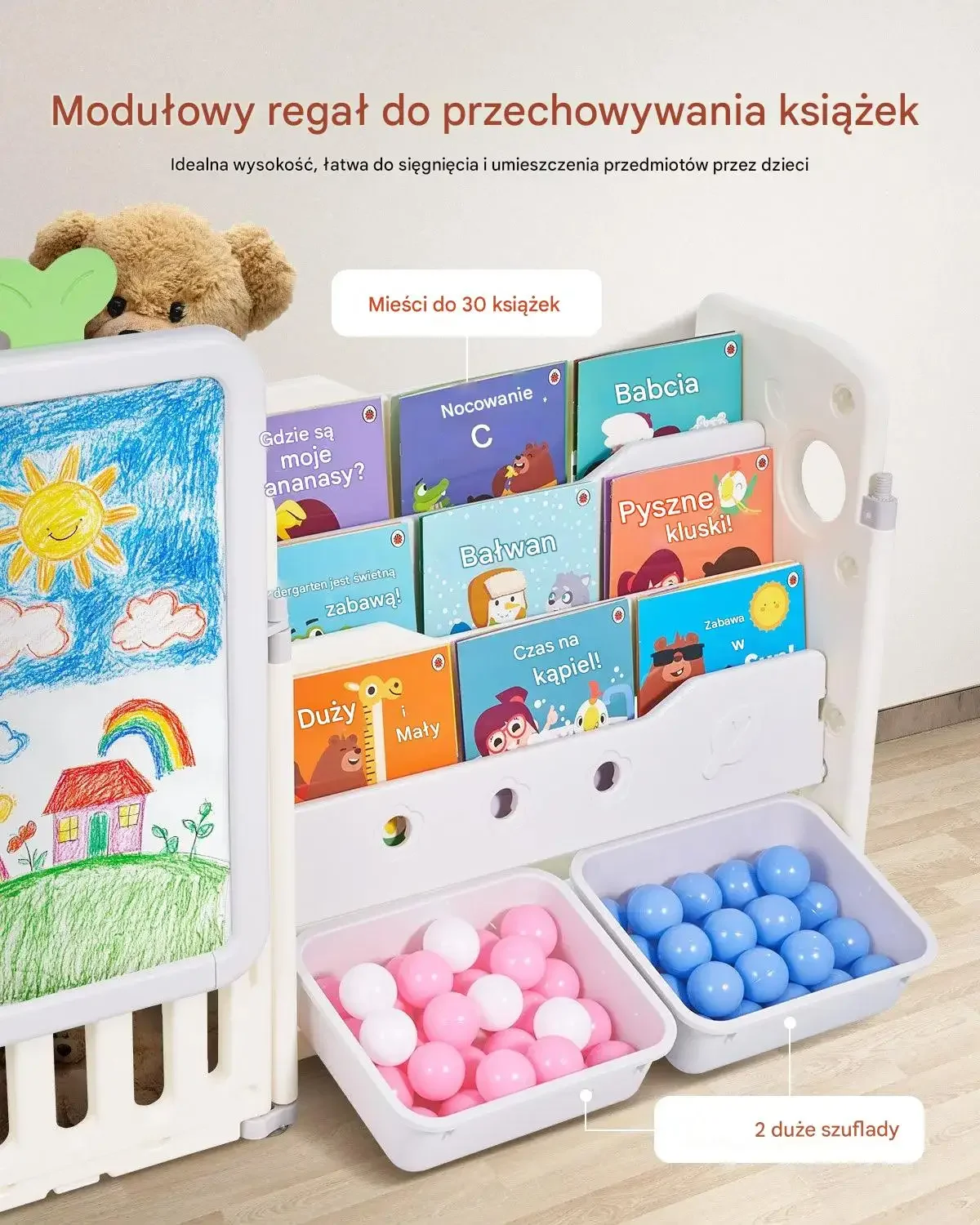 • Duża pojemność: Regał mieści do 30 książek, a pojemniki oferują dużo miejsca na zabawki.