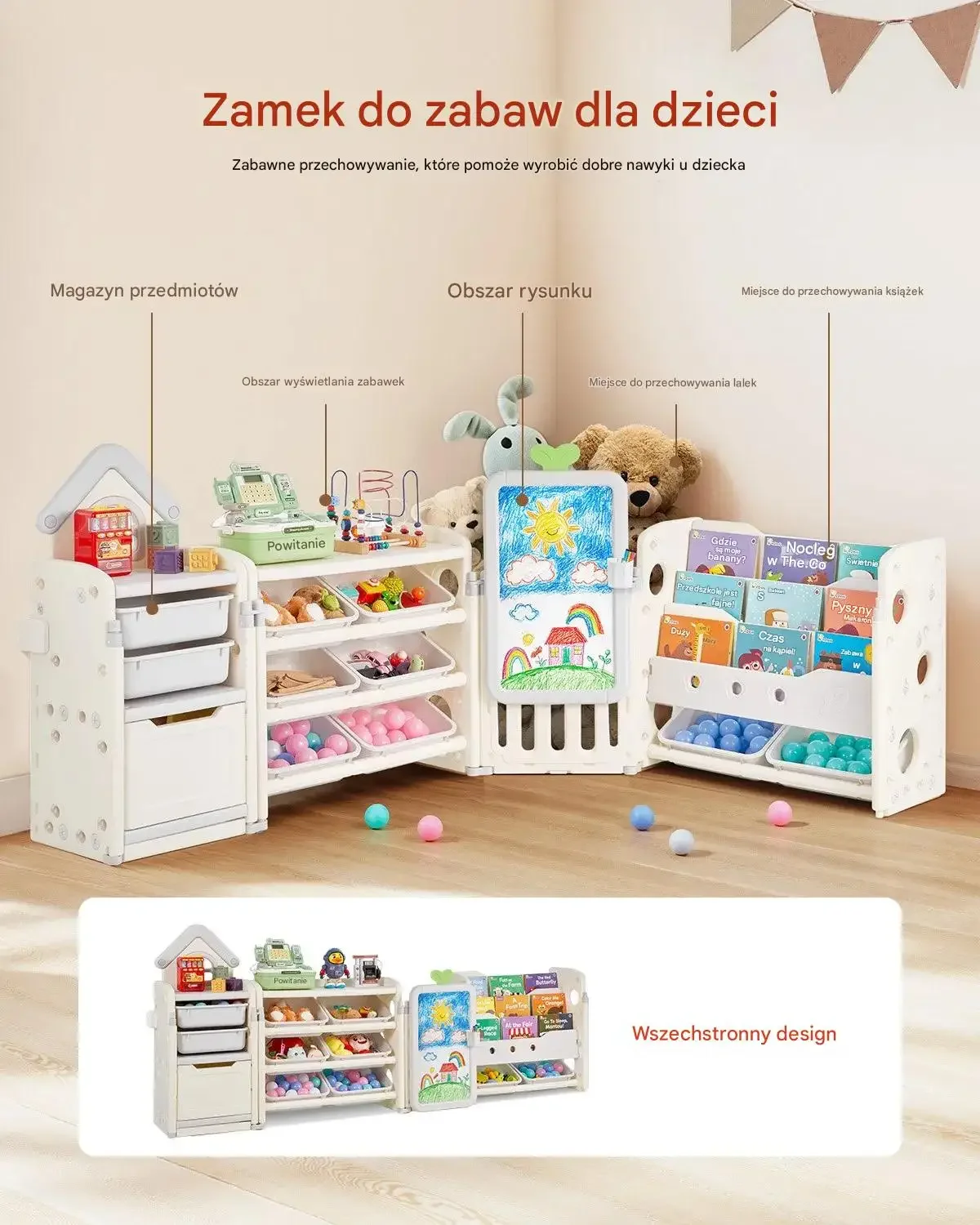 • Wielofunkcyjne przechowywanie: Strefy na zabawki, książki, akcesoria, miejsce do rysowania i przechowywania lalek.
