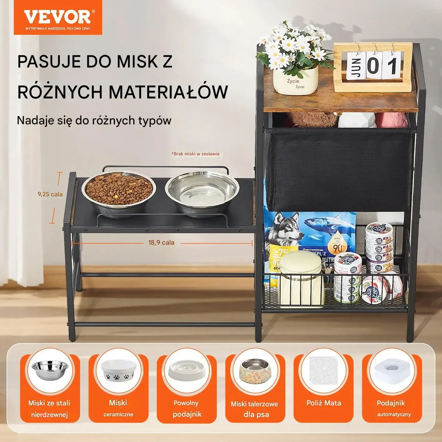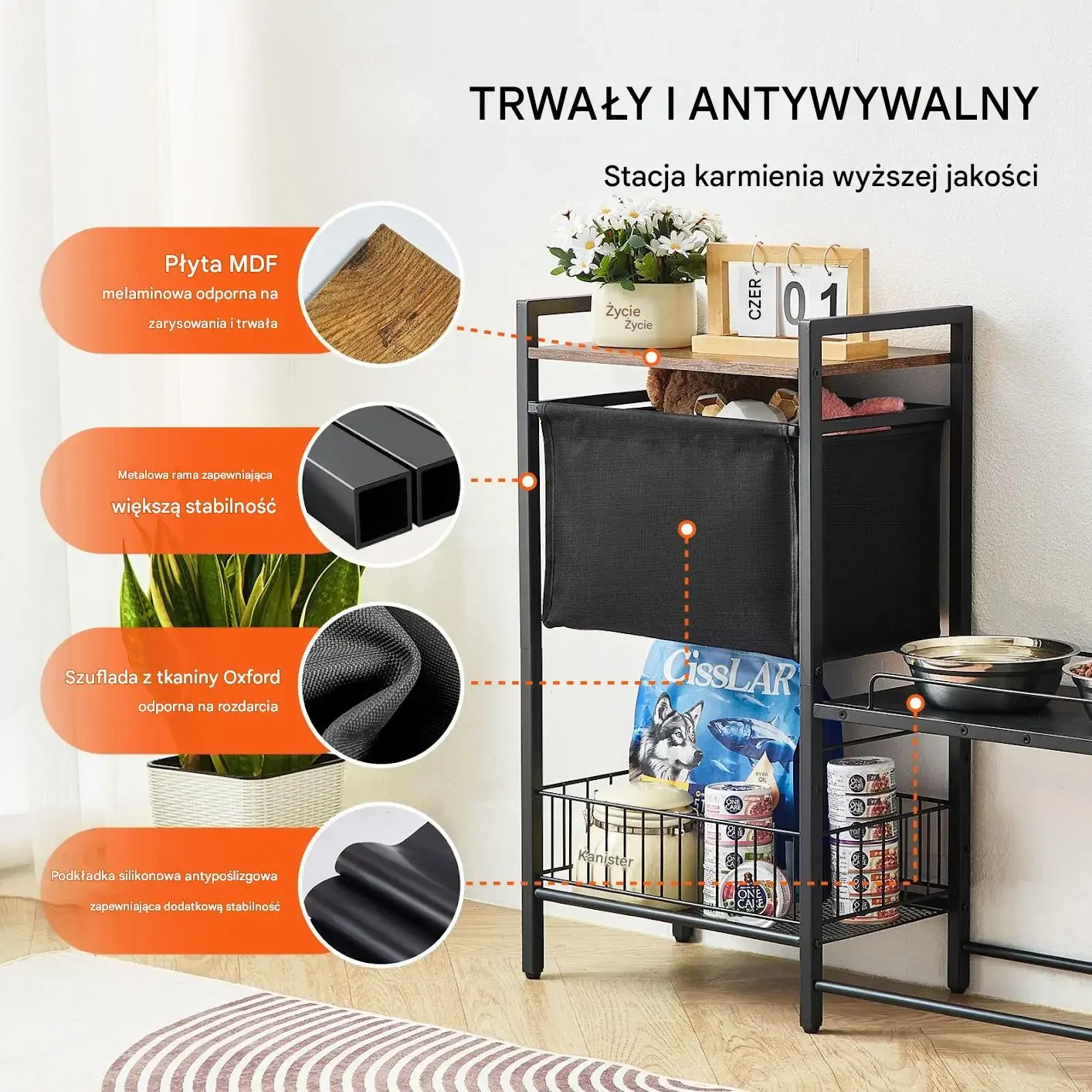 Wszechstronny mebel, który rozwiązuje problem niezdrowej pozycji podczas jedzenia i bałaganu z psimi akcesoriami. To idealne rozwiązanie dla każdego świadomego właściciela.
