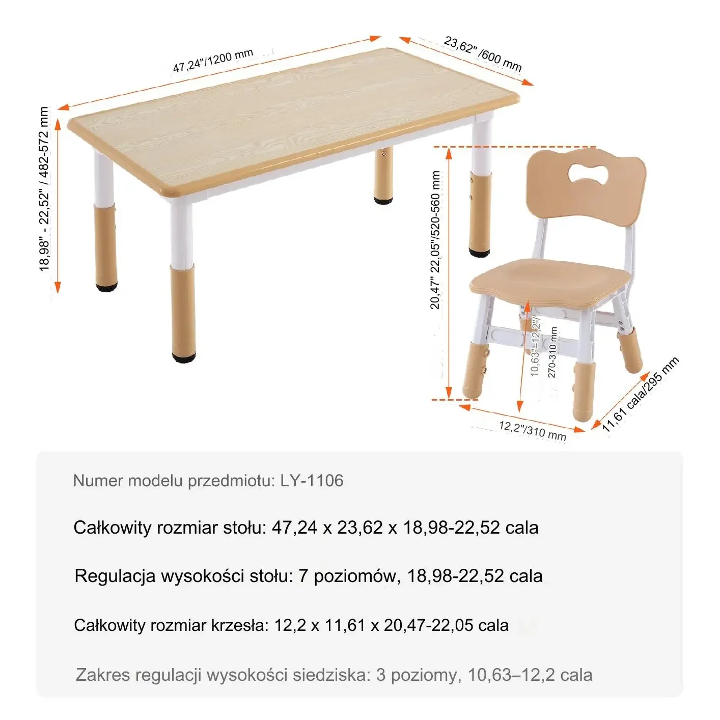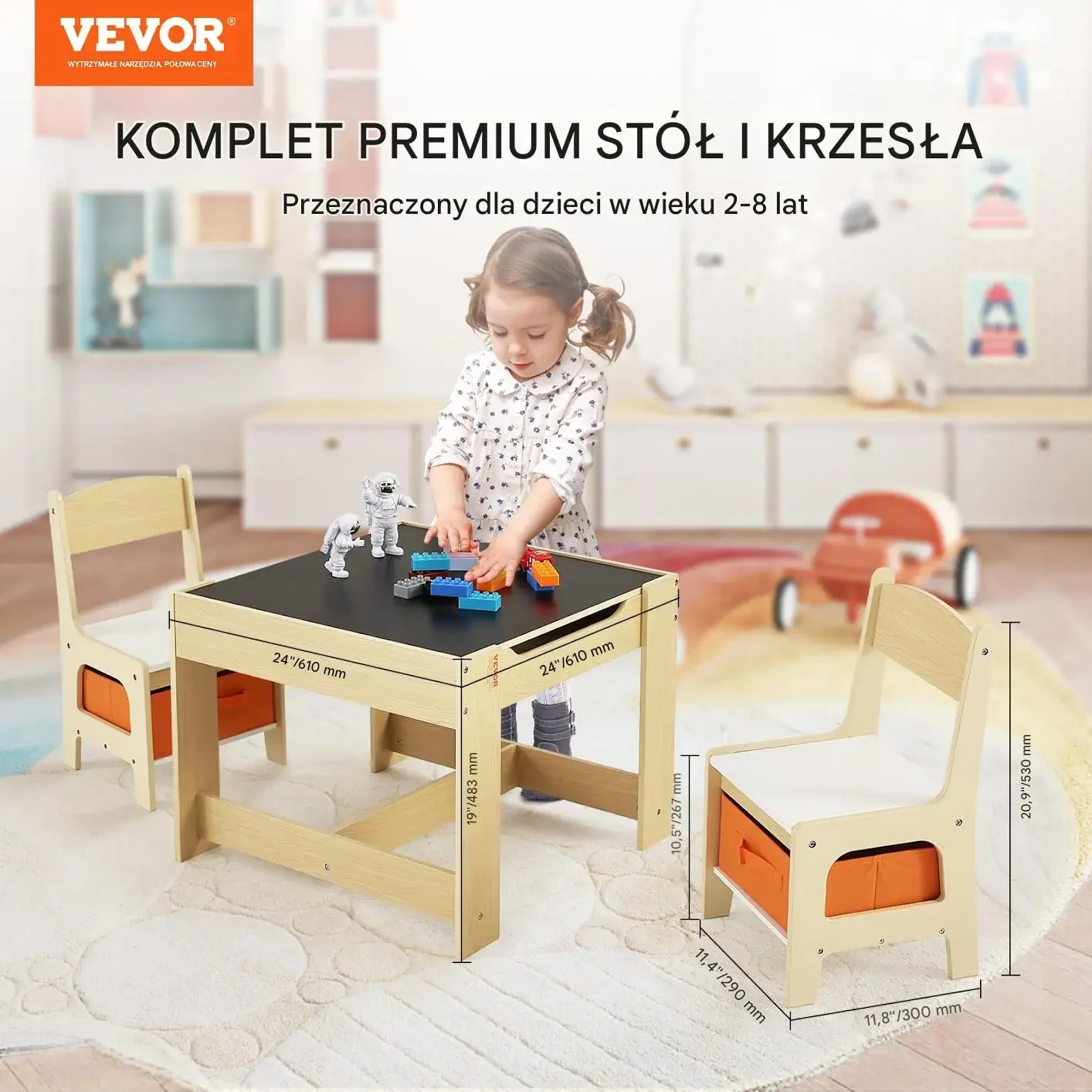 Stół i krzesła przeznaczone dla dzieci w wieku 2-8 lat. Idealny do zabawy, nauki i twórczych aktywności. Rozmiar stołu to 24″ x 24″ (610 mm x 610 mm) a wysokość wynosi 19,7″ (498 mm).