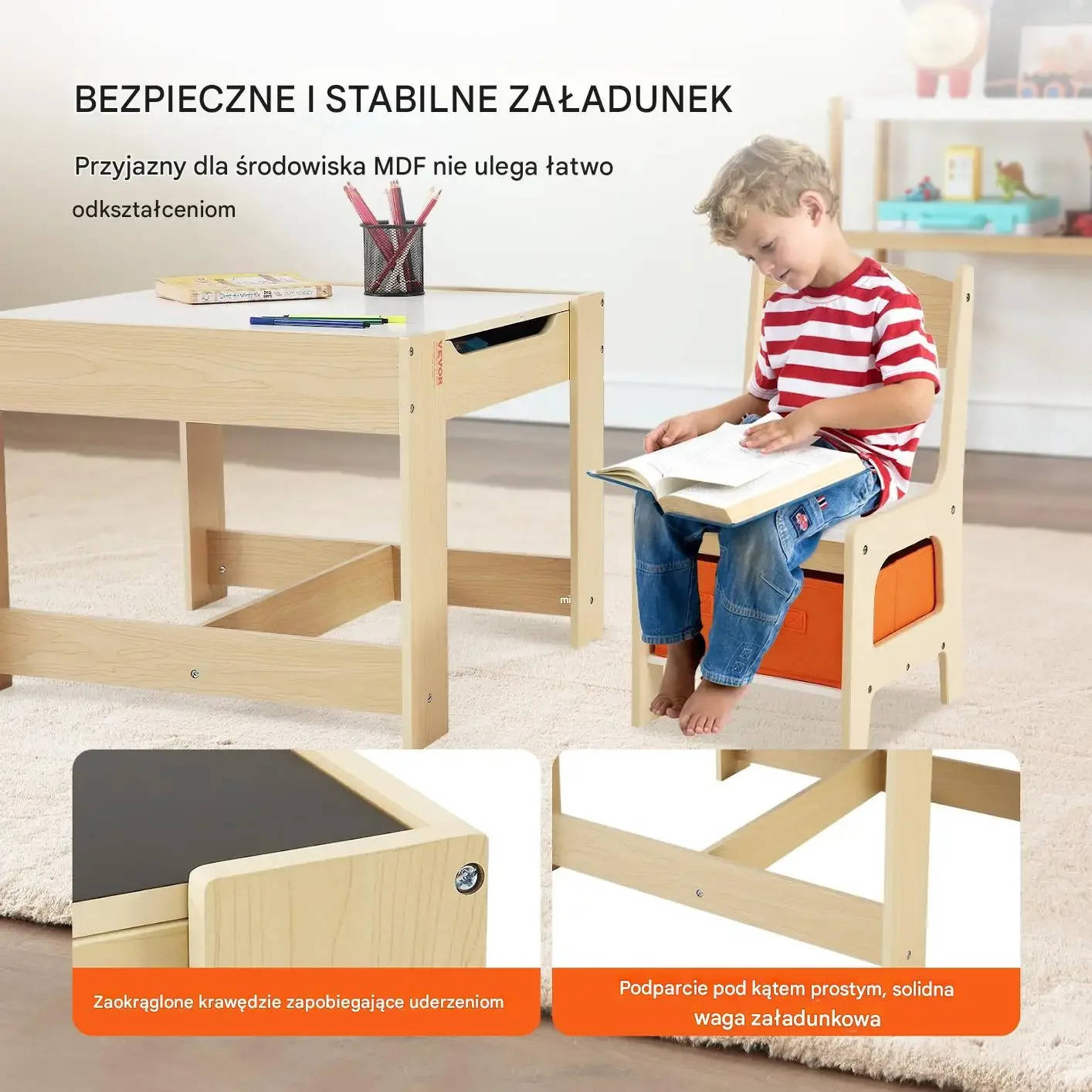 Przyjazny dla środowiska MDF jest odporny na odkształcenia. Zaokrąglone krawędzi zapobiegają zranieniom, a solidna konstrukcja zapewnia stabilność podczas użytkowania.