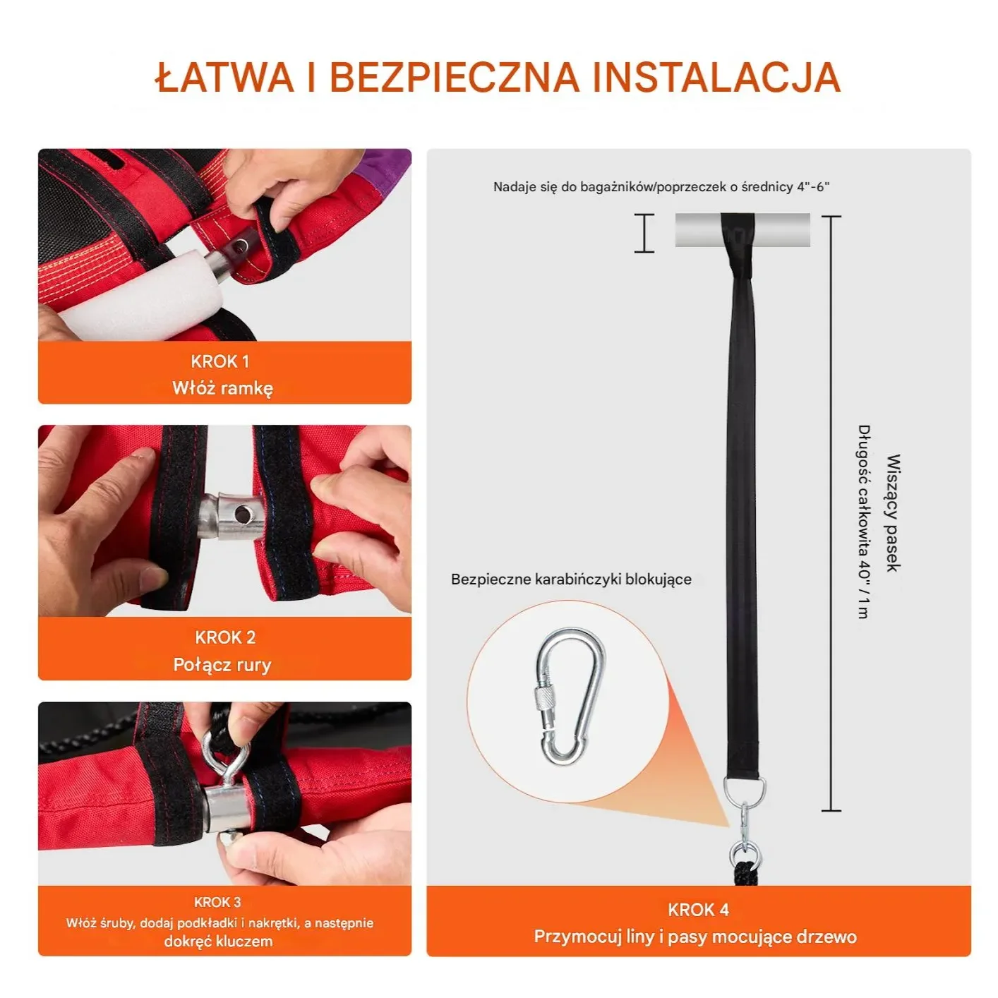 Huśtawka tarczowa zawiera dwa wzmocnione paski huśtawki o długości 1 m oraz wytrzymałe ocynkowane karabinki, które umożliwiają bezpieczne i łatwe zawieszenie huśtawki pajęczej na gałęziach drzewa (najlepiej o średnicy 10-15 cm). Montaż jest prosty i można go wykonać samodzielnie.