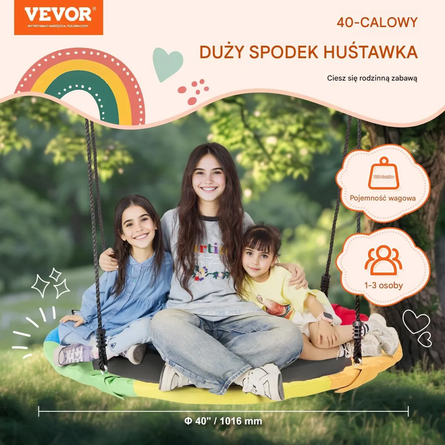 1016-milimetrowa huśtawka pajęcza zapewnia ekscytującą i pełną zabawy rozrywkę dla dzieci. Jej unikalny wygląd i duża przestronność pozwalają na zabawę 1-3 dzieciom lub dorosłym jednocześnie, wspierając wagę do 340 kg. Dzieci mogą również bezpiecznie leżeć na huśtawce i cieszyć się pięknymi widokami na świeżym powietrzu.