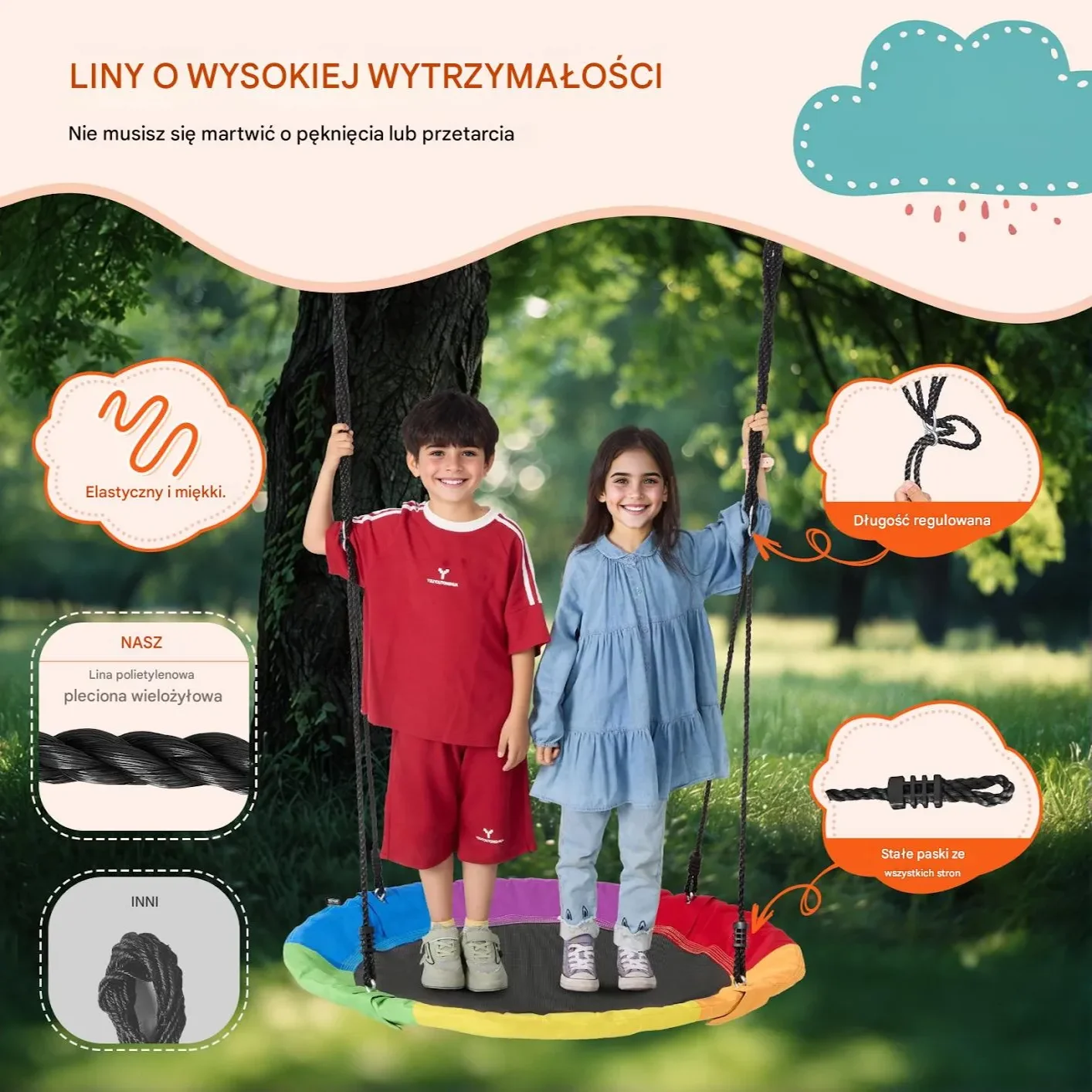 Liny huśtawki tarczowej do zabawy na zewnątrz zostały ulepszone do wielowarstwowych, splecionych lin z wysokiej jakości polietylenu (PE), które są miękkie, elastyczne i odporne na splątanie. Nie starzeją się ani nie pogarszają się nawet po długotrwałym narażeniu na działanie czynników atmosferycznych. Końce lin są wzmocnione, aby zapobiec strzępieniu. Dodatkowo, regulowana długość lin umożliwia regulację wysokości zawieszenia w zakresie 1,1 m-1,5 m, co pasuje do większości wysokości zawieszenia.