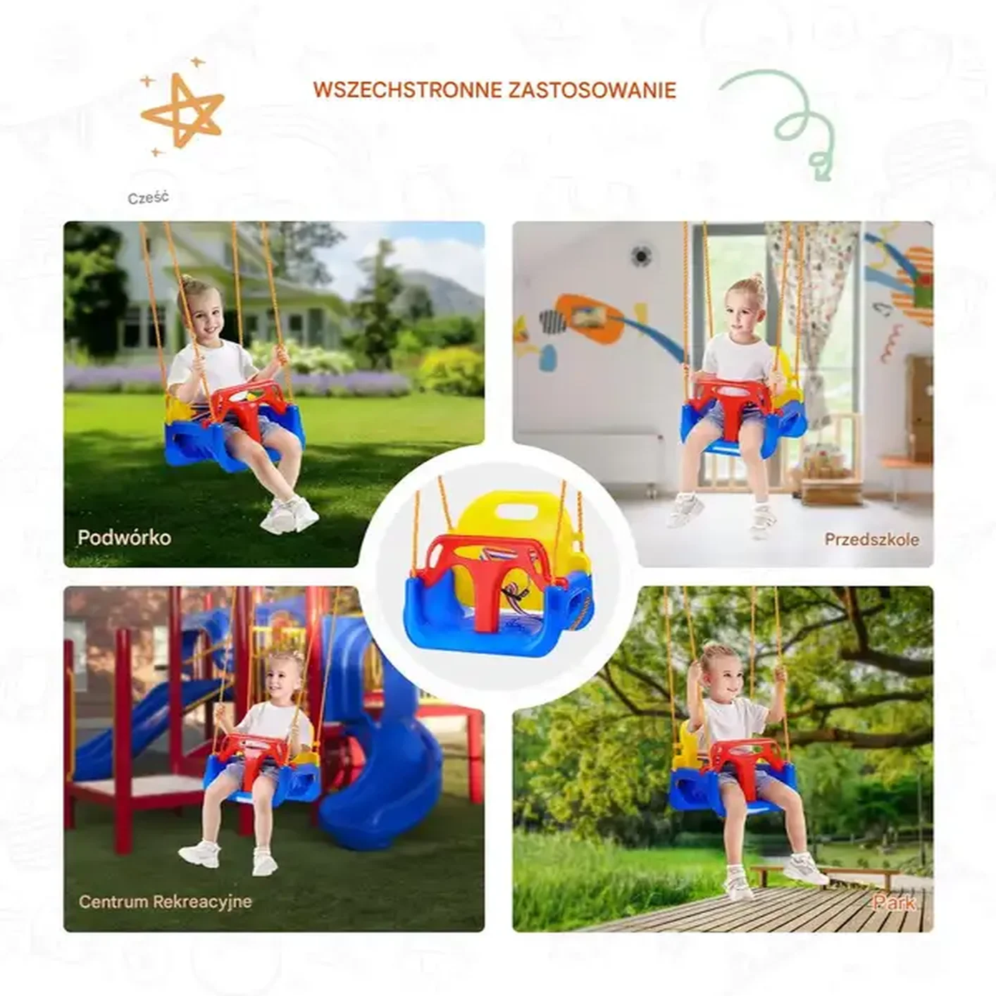 ✔ Huśtawka typu „talerz” – wygodne i przestronne siedzisko dla jednej lub dwóch osób.