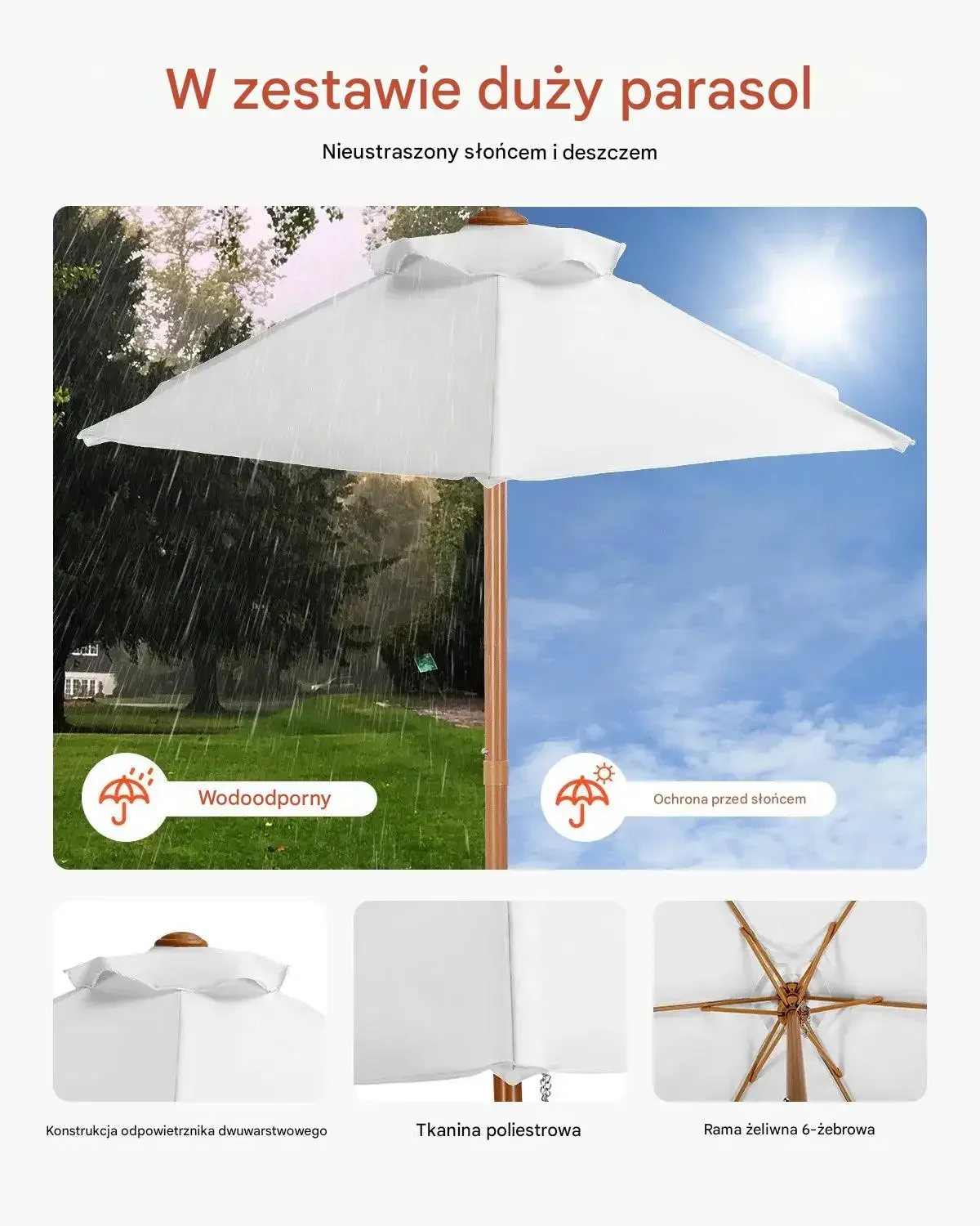 W zestawie znajduje się duży parasol, który zapewnia ochronę zarówno przed słońcem, jak i deszczem. Dwuwarstwowa konstrukcja odpowietrznika w połączeniu z wodoodporną tkaniną poliestrową i 6-żebrową ramą żeliwną gwarantuje trwałość i skuteczną ochronę przed warunkami atmosferycznymi.