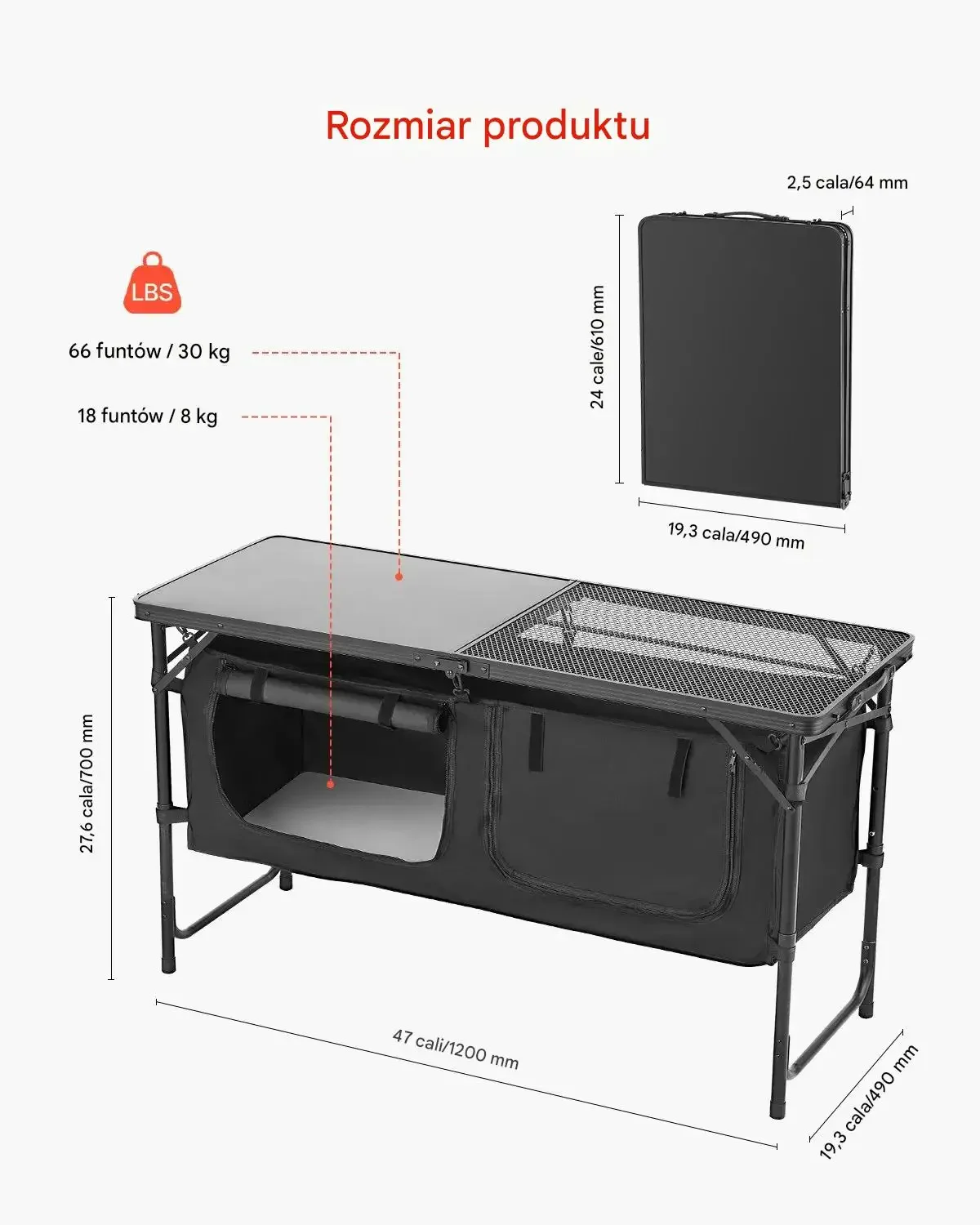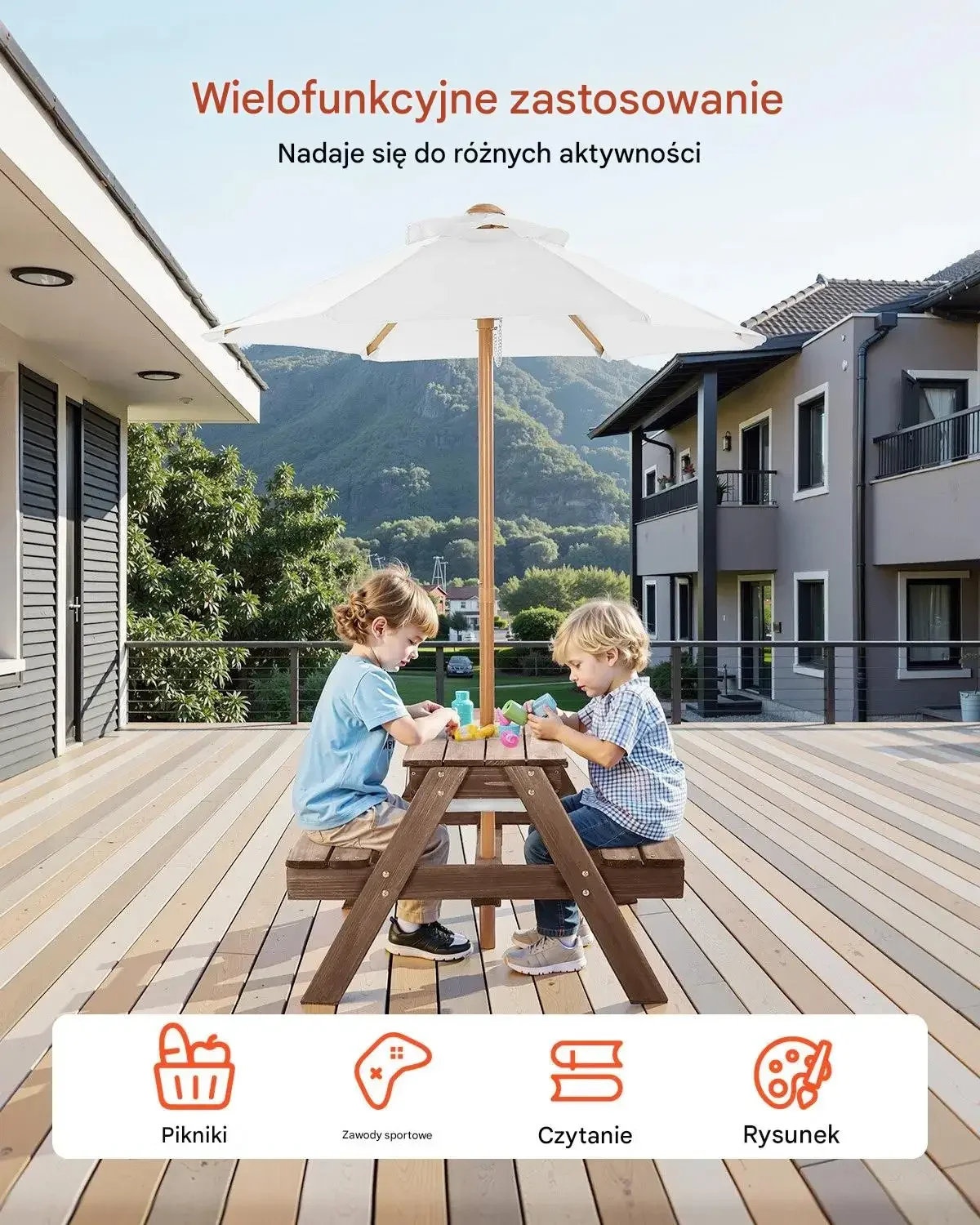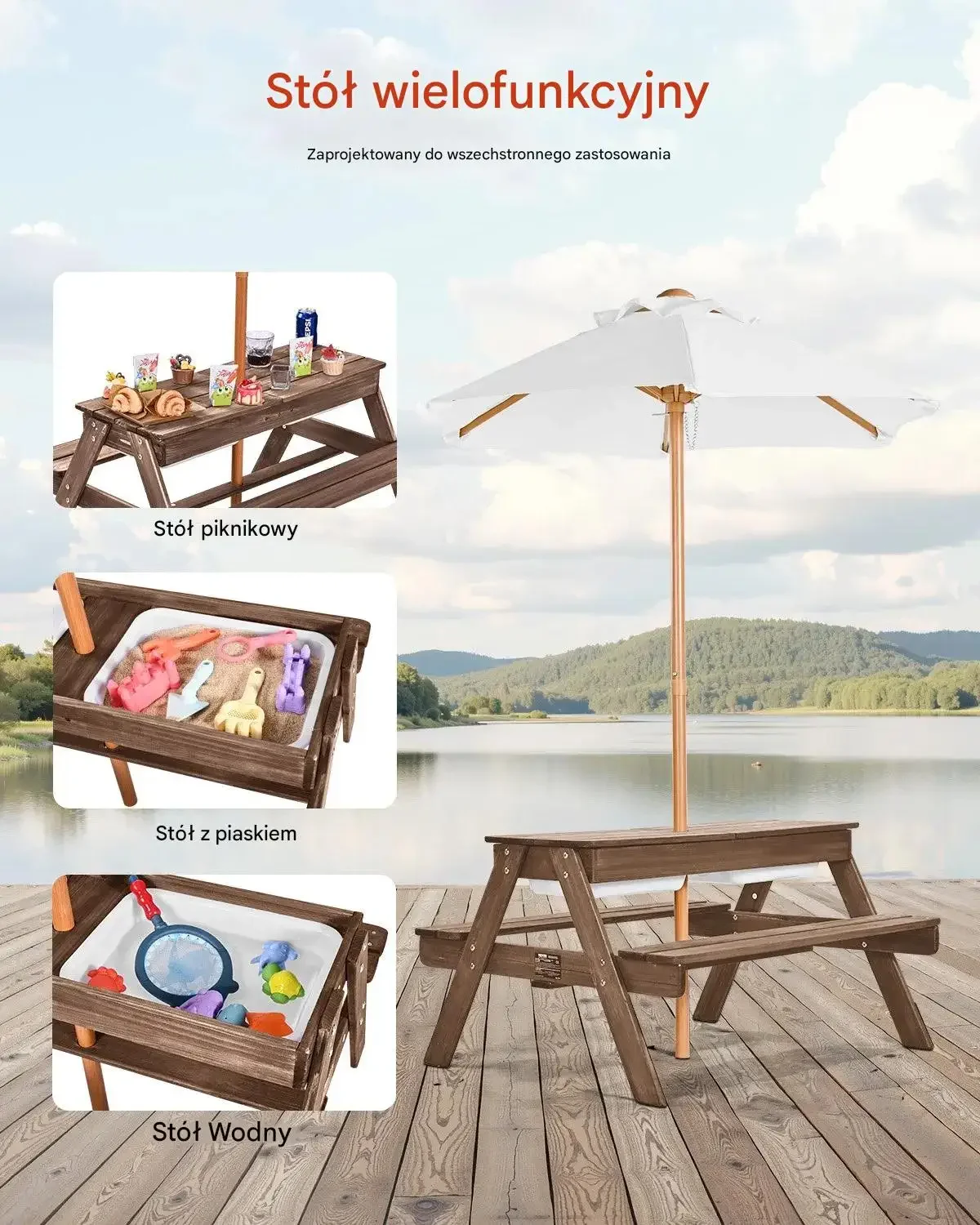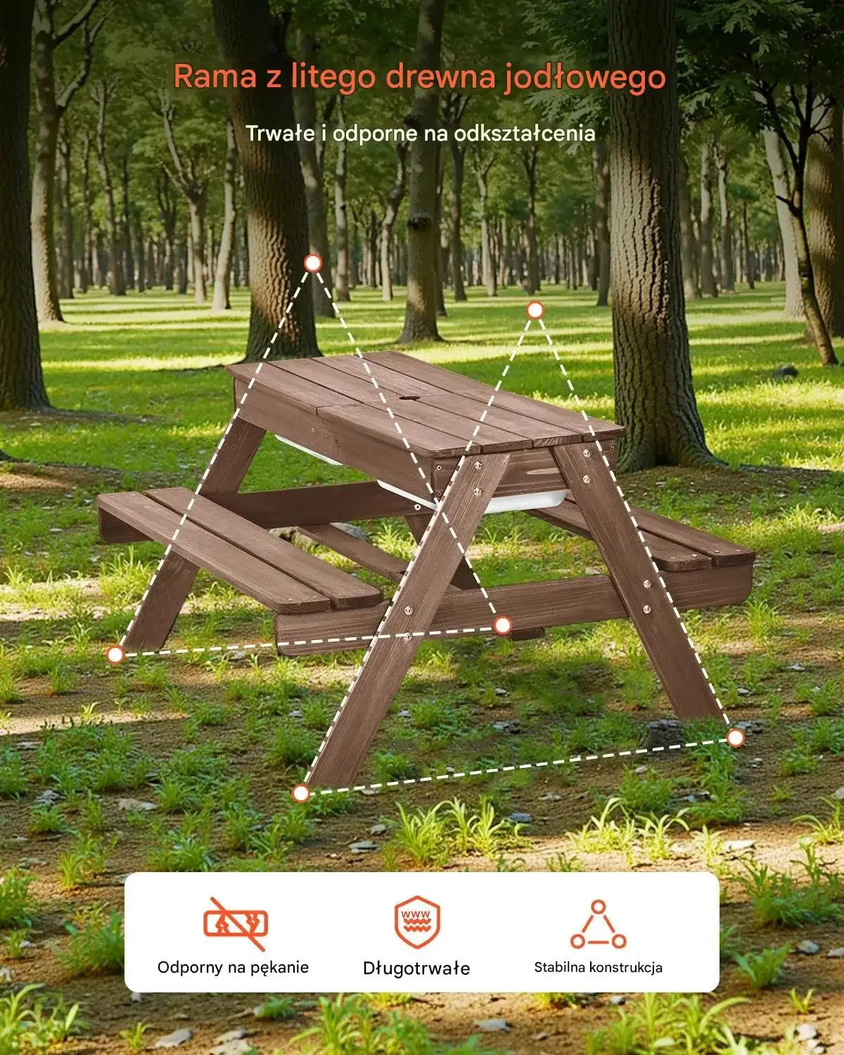 Stół został zaprojektowany do wszechstronnego zastosowania. Może służyć jako tradycyjny stół piknikowy, stół z piaskiem dla dzieci lub stół wodny, co czyni go idealnym rozwiązaniem do różnych aktywności na świeżym powietrzu.