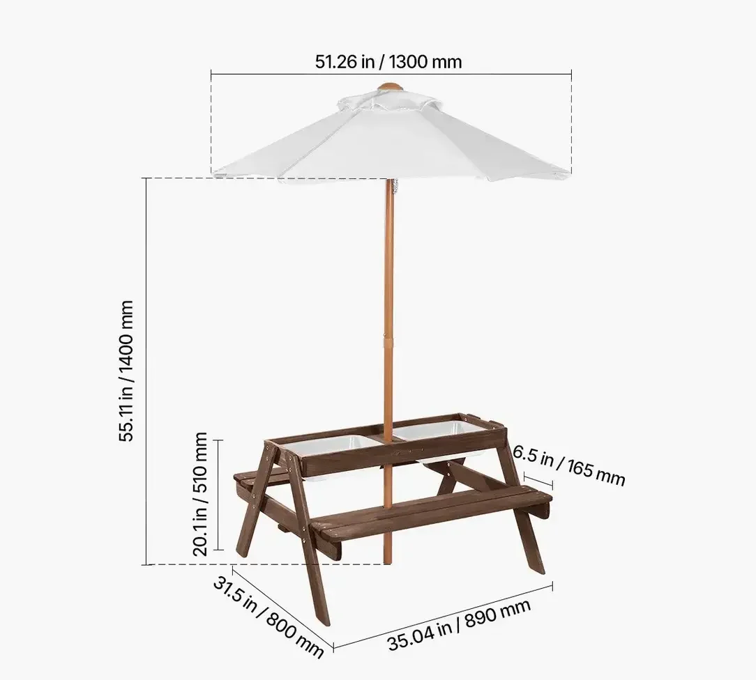• Wielofunkcyjny blat: Blat stołu jest wymienny – może służyć jako stół piknikowy, stół do piasku lub stół do wody dla dzieci