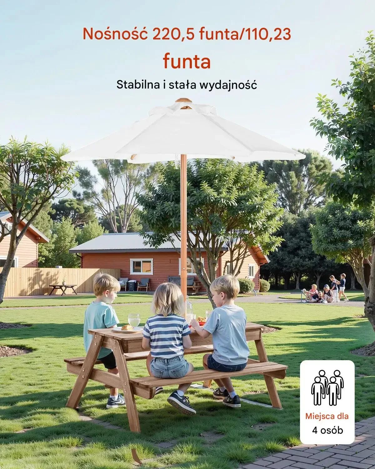 Stół Piknikowy z Ławkami i Parasolem – Drewniany Zestaw Ogrodowy z Jodły