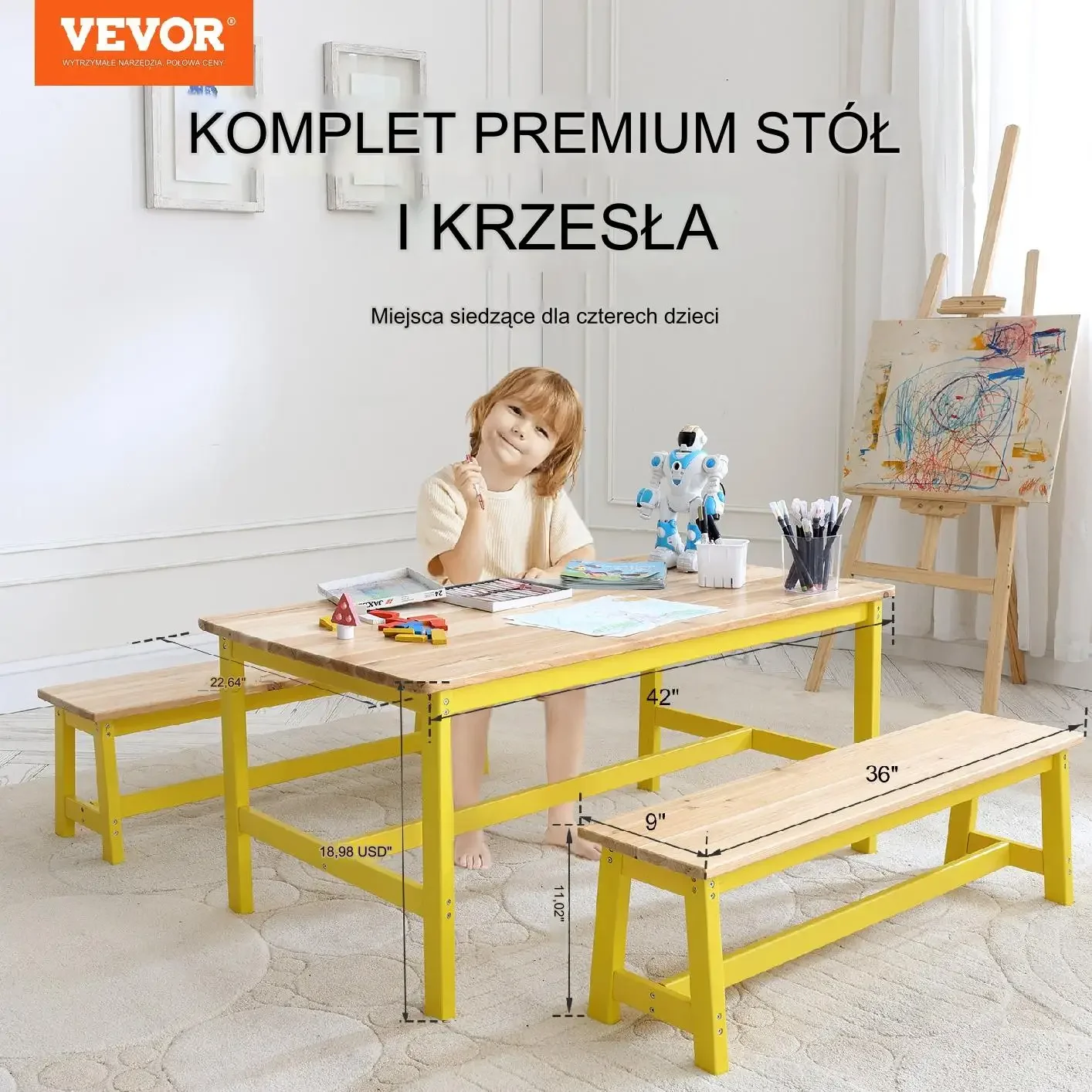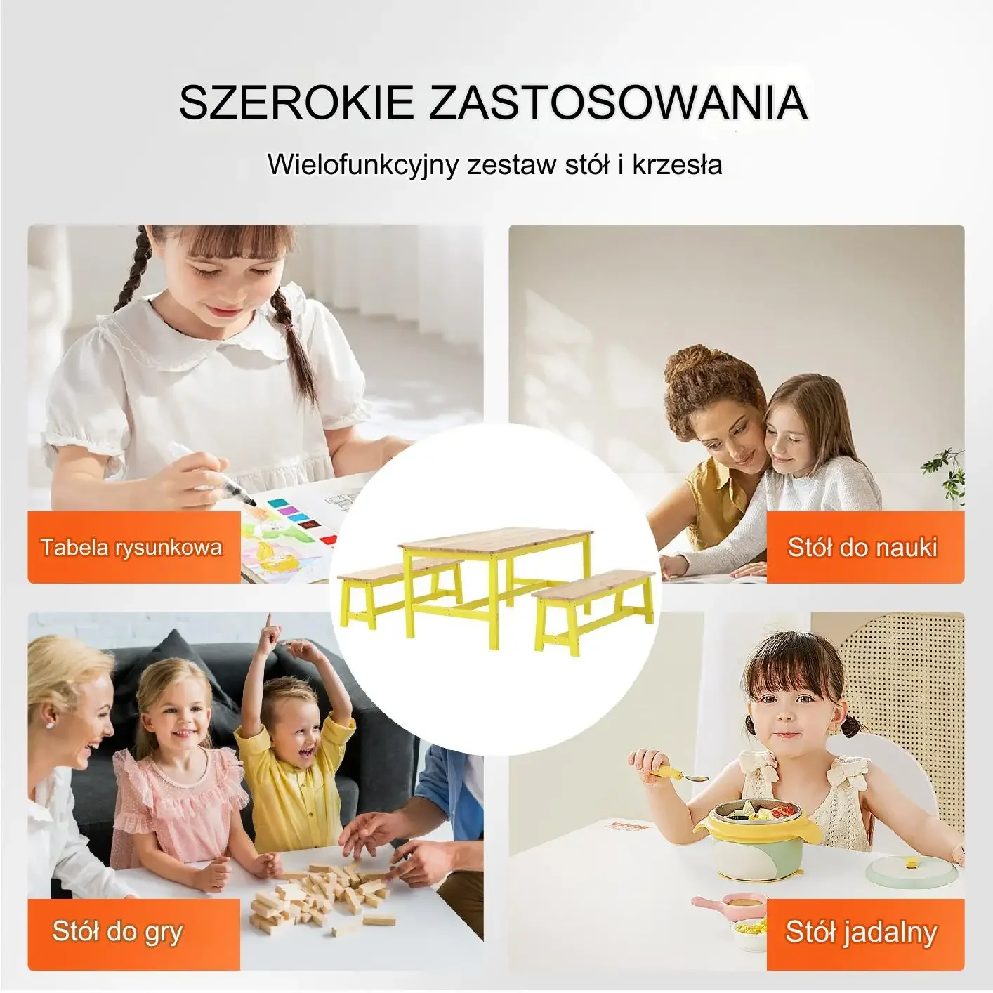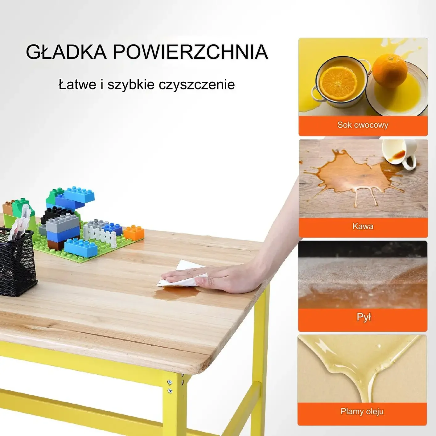 Ten zestaw stolików i krzesełek dla dzieci charakteryzuje się przyjemnym połączeniem jasnego drewna i żółtych kolorów, tworząc prosty i elegancki styl, który uzupełnia różne ustawienia. Jest wykonany z wytrzymałego drewna, co zwiększa jego trwałość.