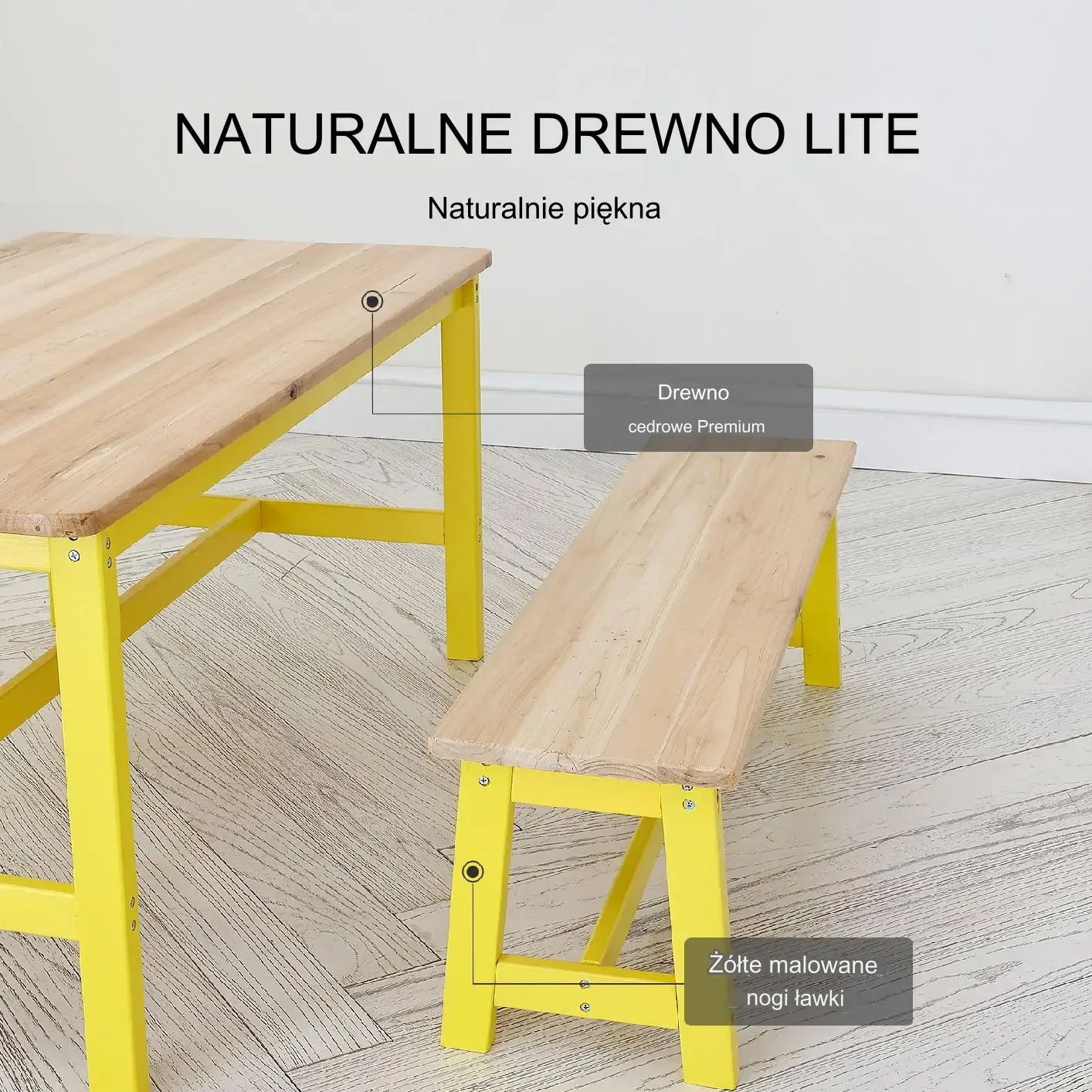 Zestaw wykonany jest z naturalnego drewna litego, a konkretnie z drewna cedrowego Premium, co gwarantuje naturalne piękno i wytrzymałość. Nogi stołu i ławek są pomalowane na żółto, nadając zestawowi atrakcyjny wygląd. Gładka powierzchnia ułatwia szybkie i łatwe czyszczenie z soków owocowych, kawy, pyłu czy plam oleju.