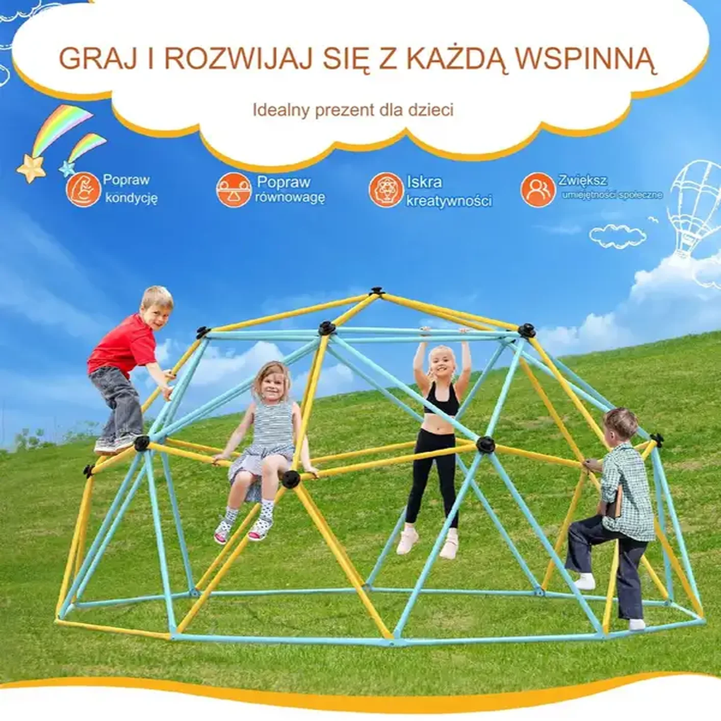 - ✅ Wielofunkcyjna zabawa: Kopuła umożliwia wspinaczkę, zwisanie, bujanie i kreatywną zabawę dla dzieci.