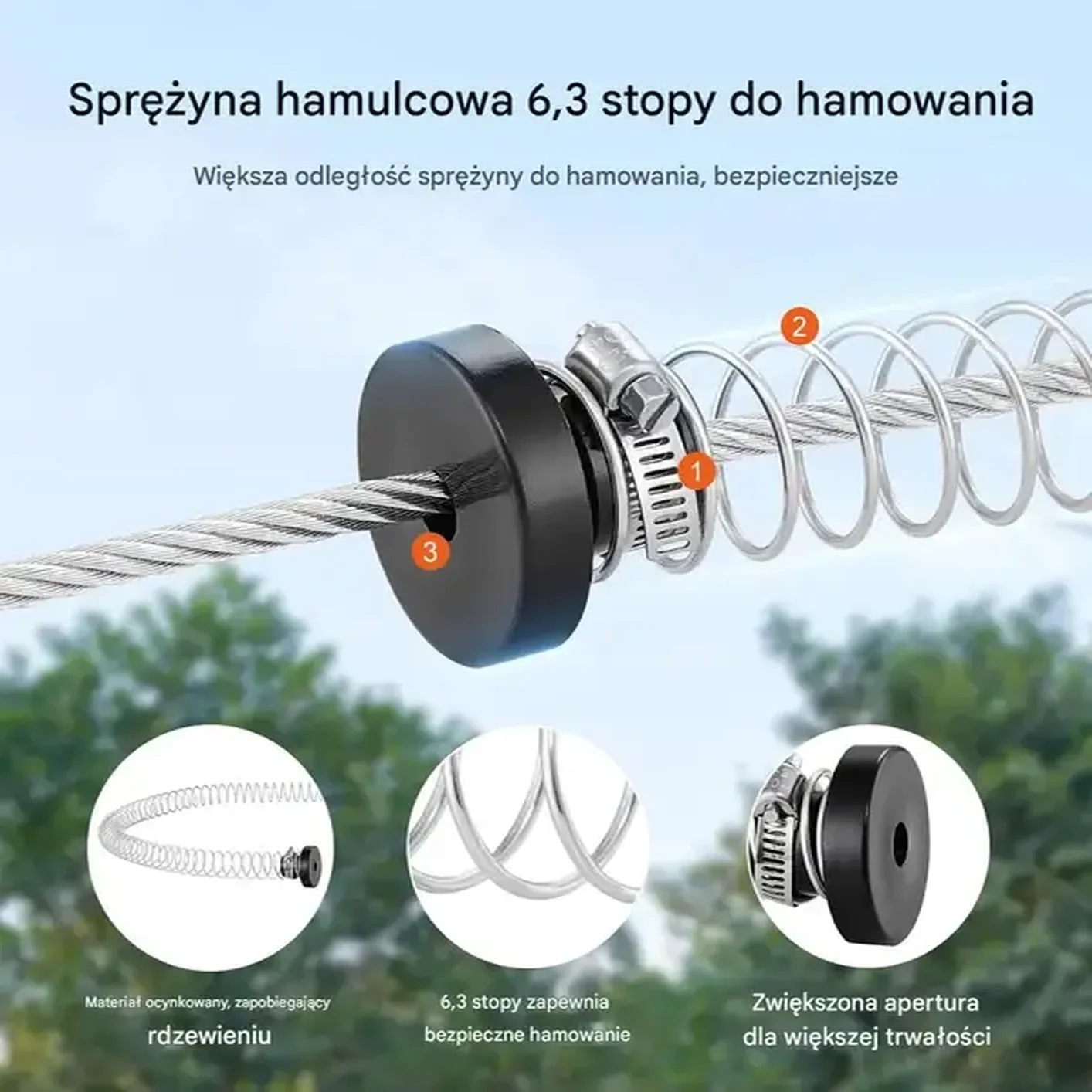 - ✅ Przedłużony hamulec sprężynowy: Długość 1,95 m, stal nierdzewna, zapewnia bezpieczne zatrzymanie i kontrolę prędkości