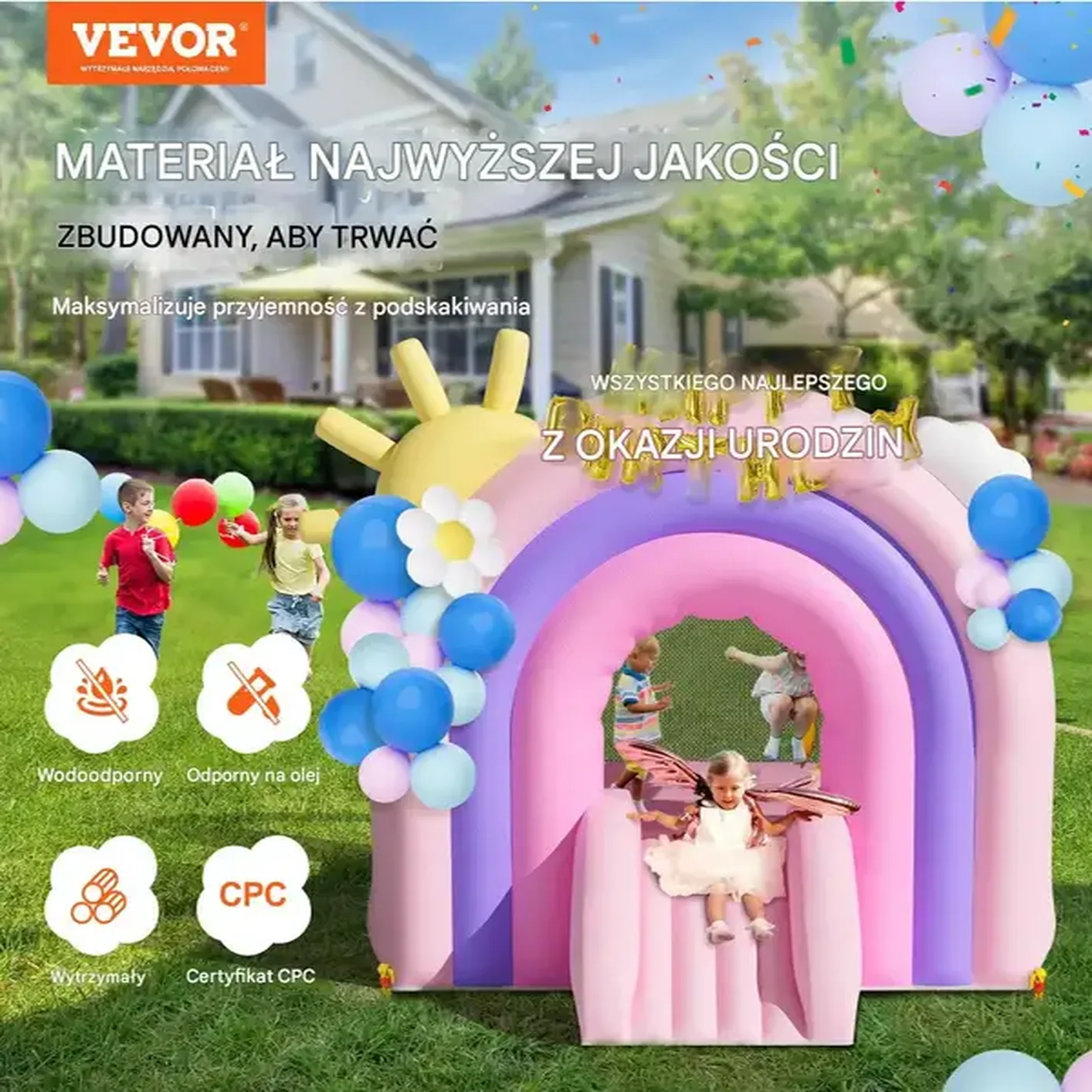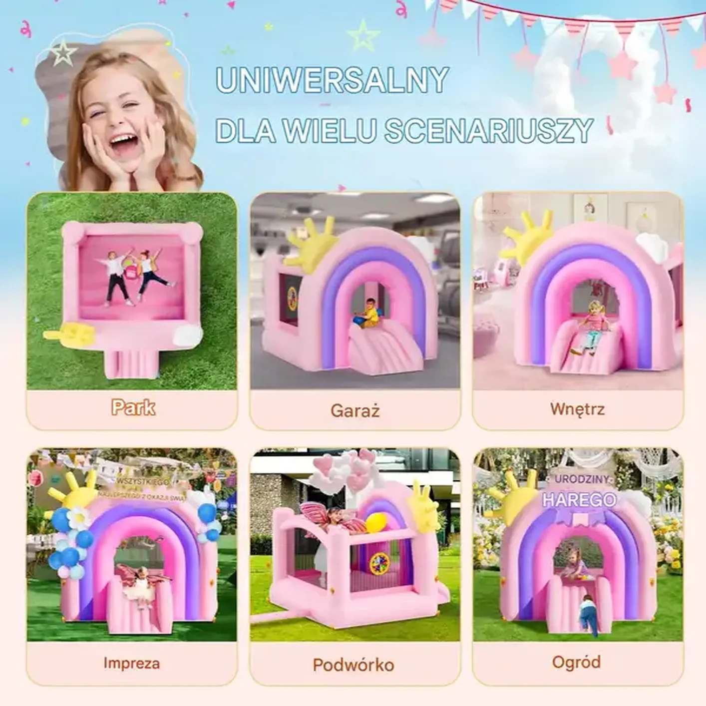 Idealne rozwiązanie na codzienną aktywność w domu i ogrodzie! Kompaktowy dmuchany zamek łączy trampolinę, zjeżdżalnię i grę zręcznościową w jednej bajkowej przestrzeni. Przeznaczony dla dzieci w wieku 3–8 lat, zachęca do ruchu, rozwija koordynację i dostarcza mnóstwa radości. Szybki montaż, pastelowy design i wysoki poziom bezpieczeństwa sprawiają, że zabawa może trwać bez końca – przez cały rok!