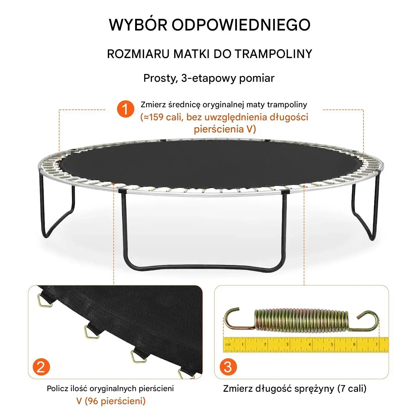 Prosty, 3-etapowy pomiar: zmierz średnicę oryginalnej maty trampoliny, policz ilość oryginalnych pierścieni i zmierz długość sprężyny.