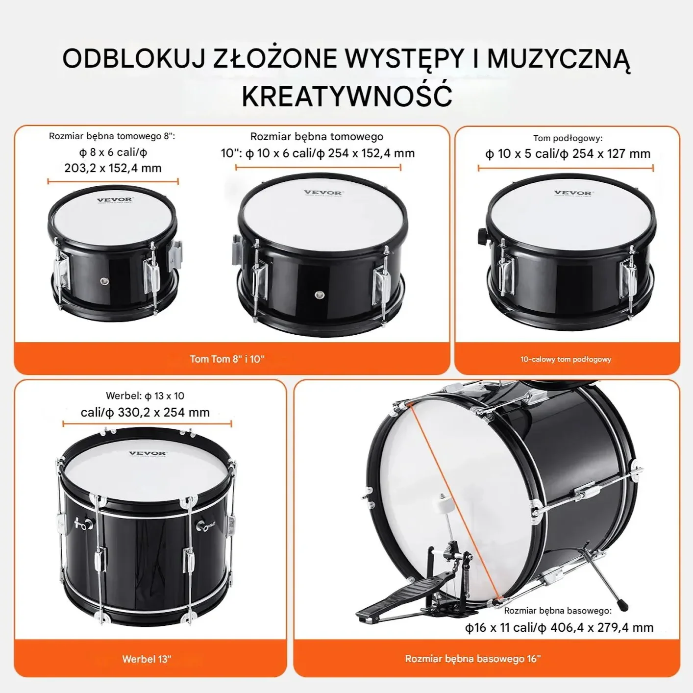 • Wymiary bębnów: Centrala 16″, werbel 10″, tomy 8″ i 10″, floor tom 13″