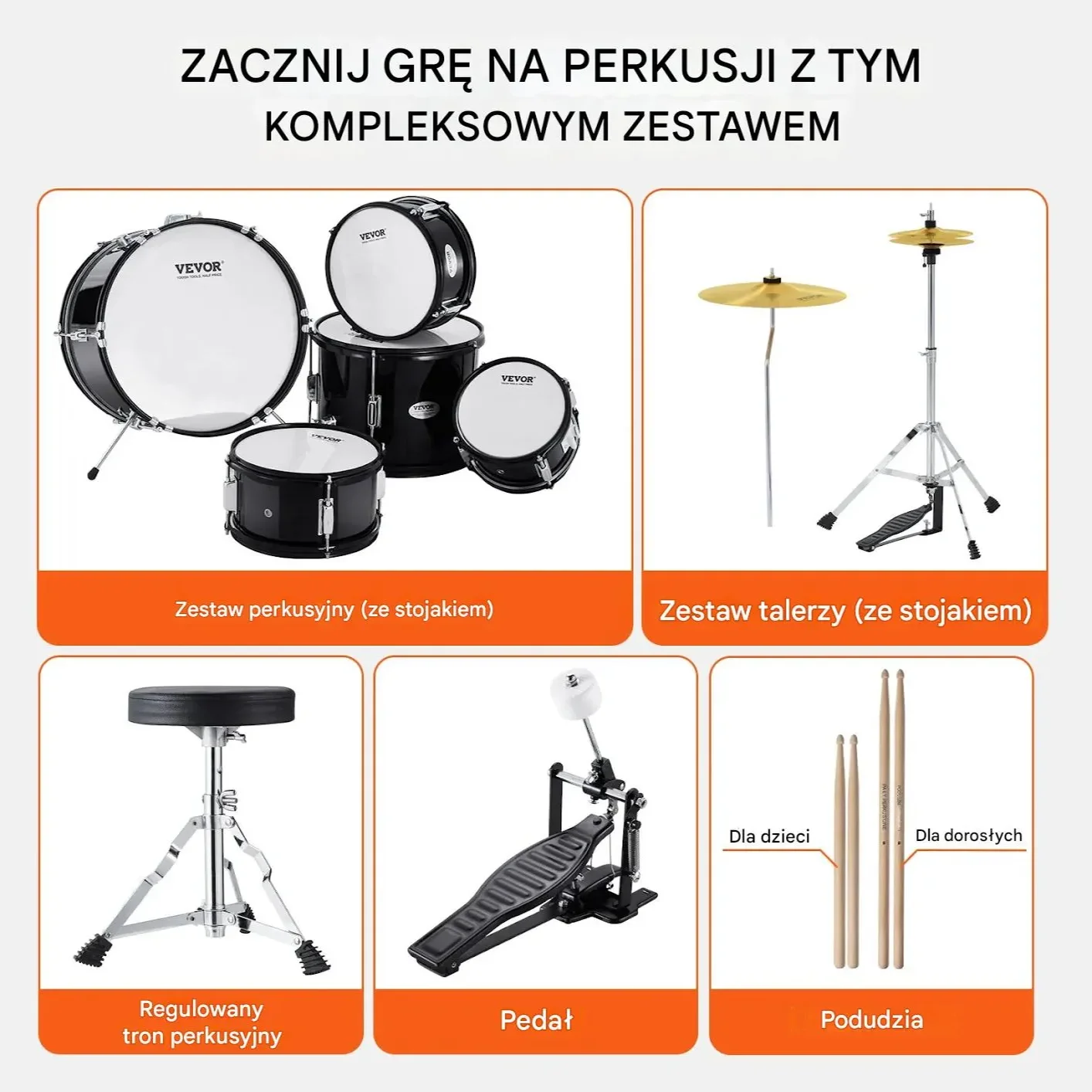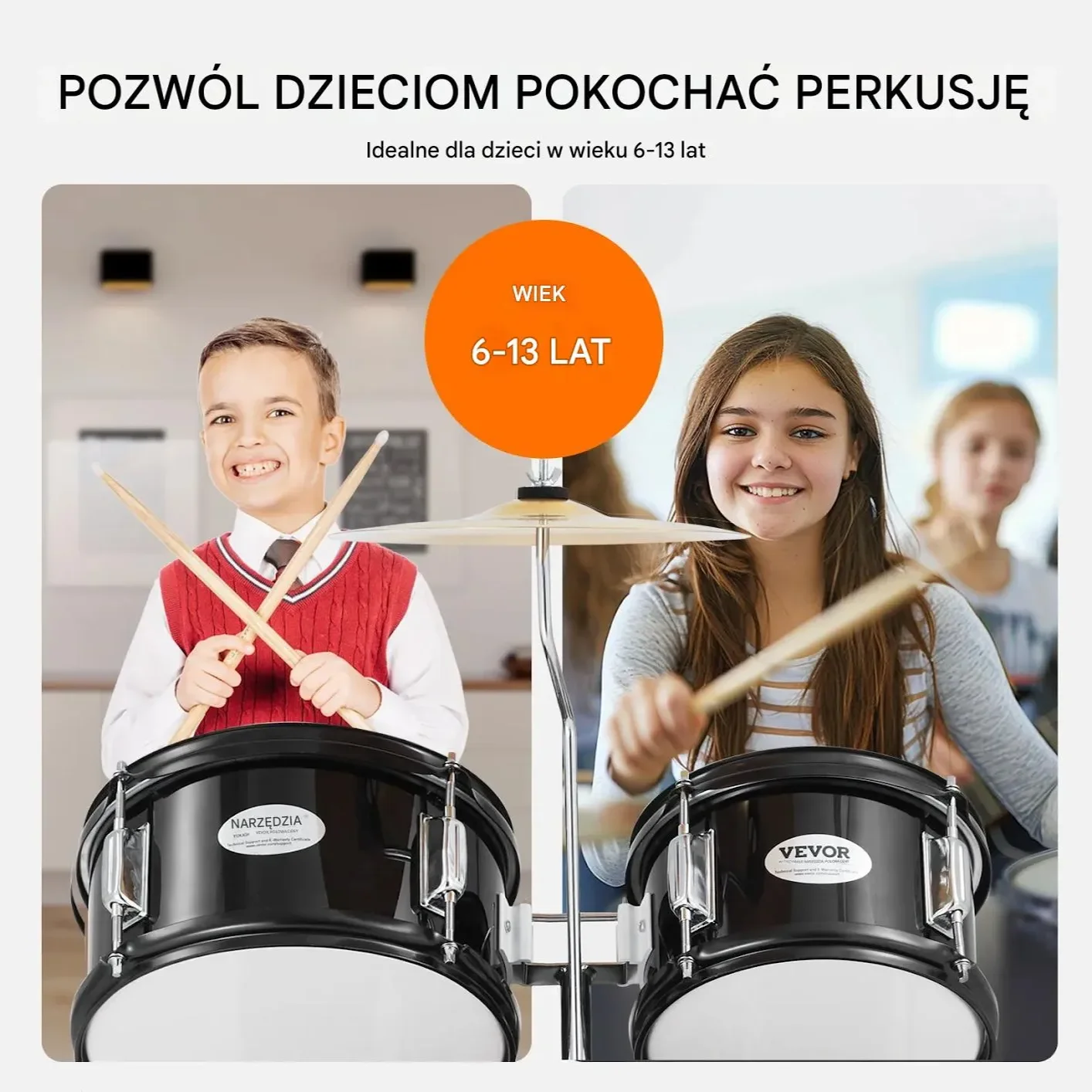 • Nauka gry na perkusji: Idealny zestaw dla dzieci w wieku 6–13 lat, które rozpoczynają swoją muzyczną przygodę