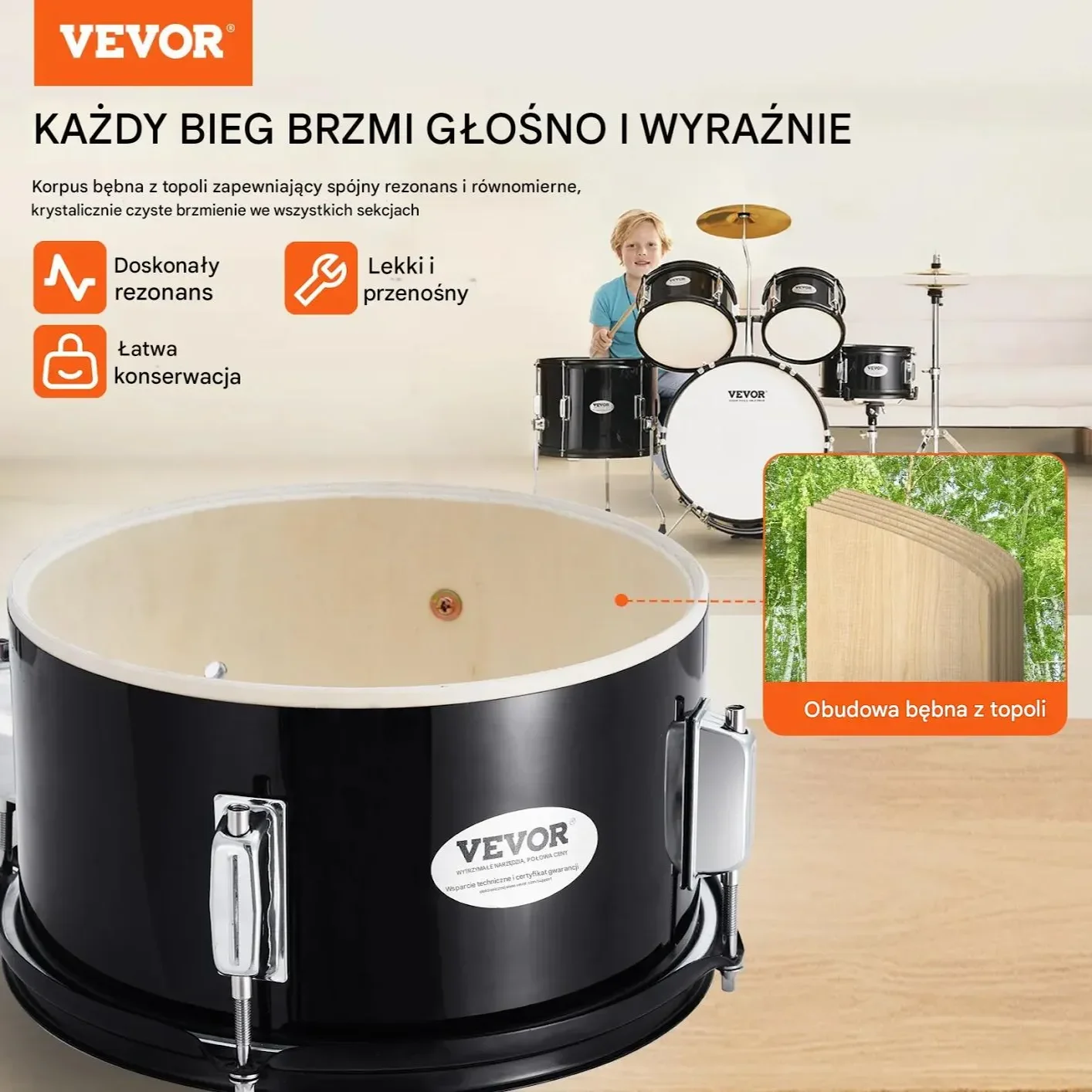 • Wysokiej jakości brzmienie: Korpusy bębnów wykonane z topoli, zapewniające ciepłe i rezonujące tony