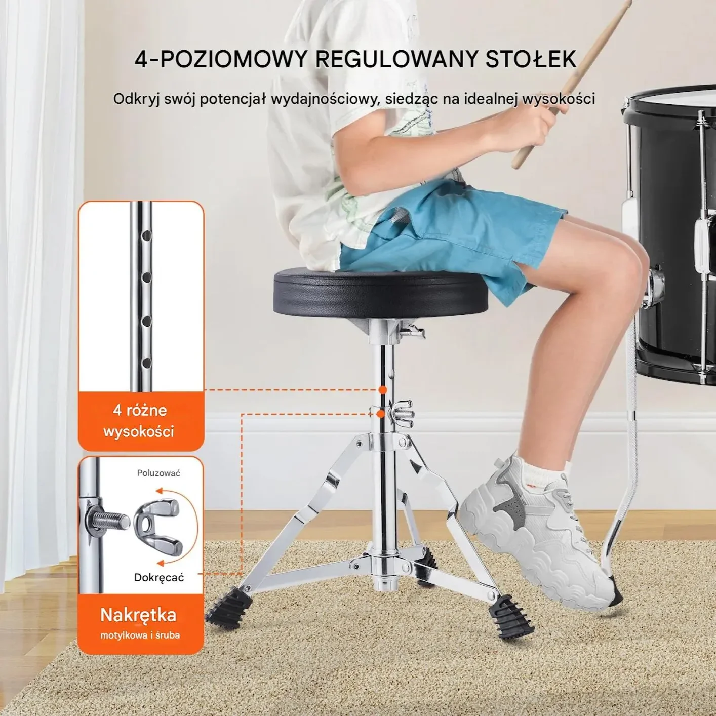 • Regulowany stołek: 4 poziomy wysokości dla wygodnej gry w każdym wieku