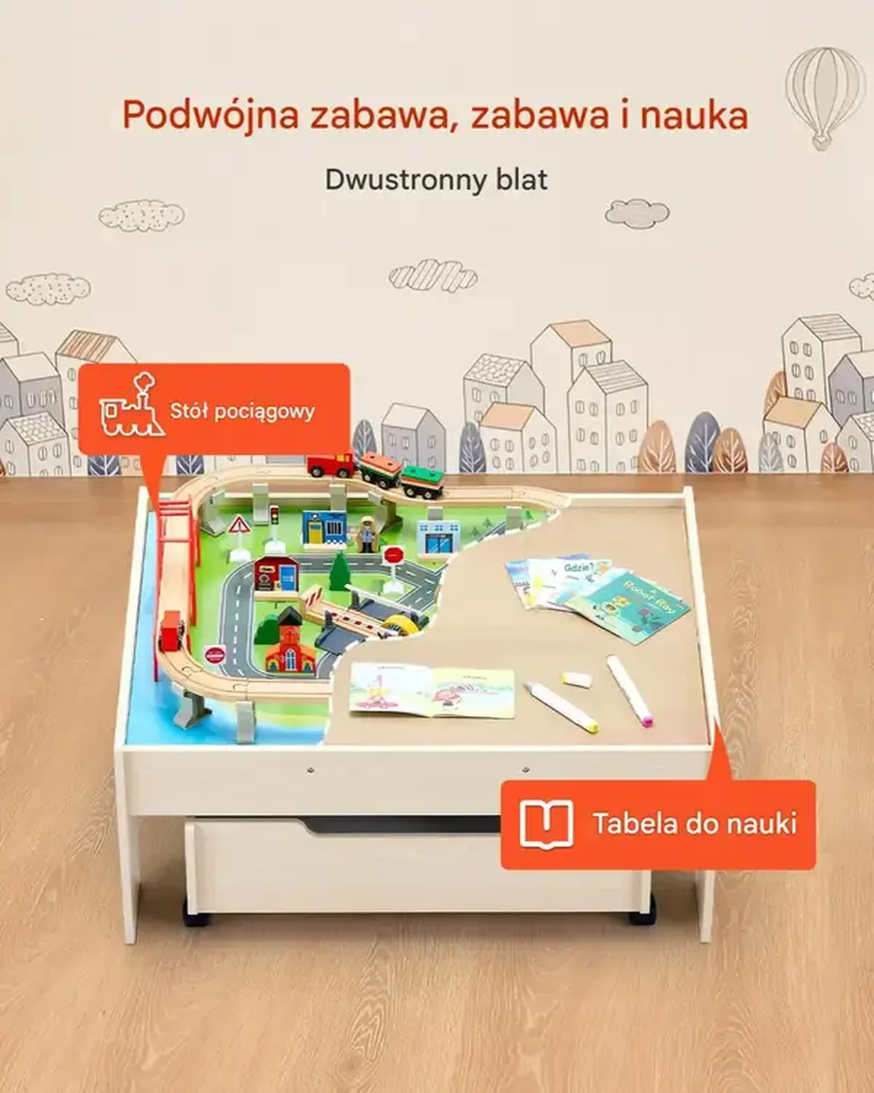 • Dwustronny blat: Jeden bok do zabawy torami kolejowymi, drugi do nauki, rysowania i prac plastycznych