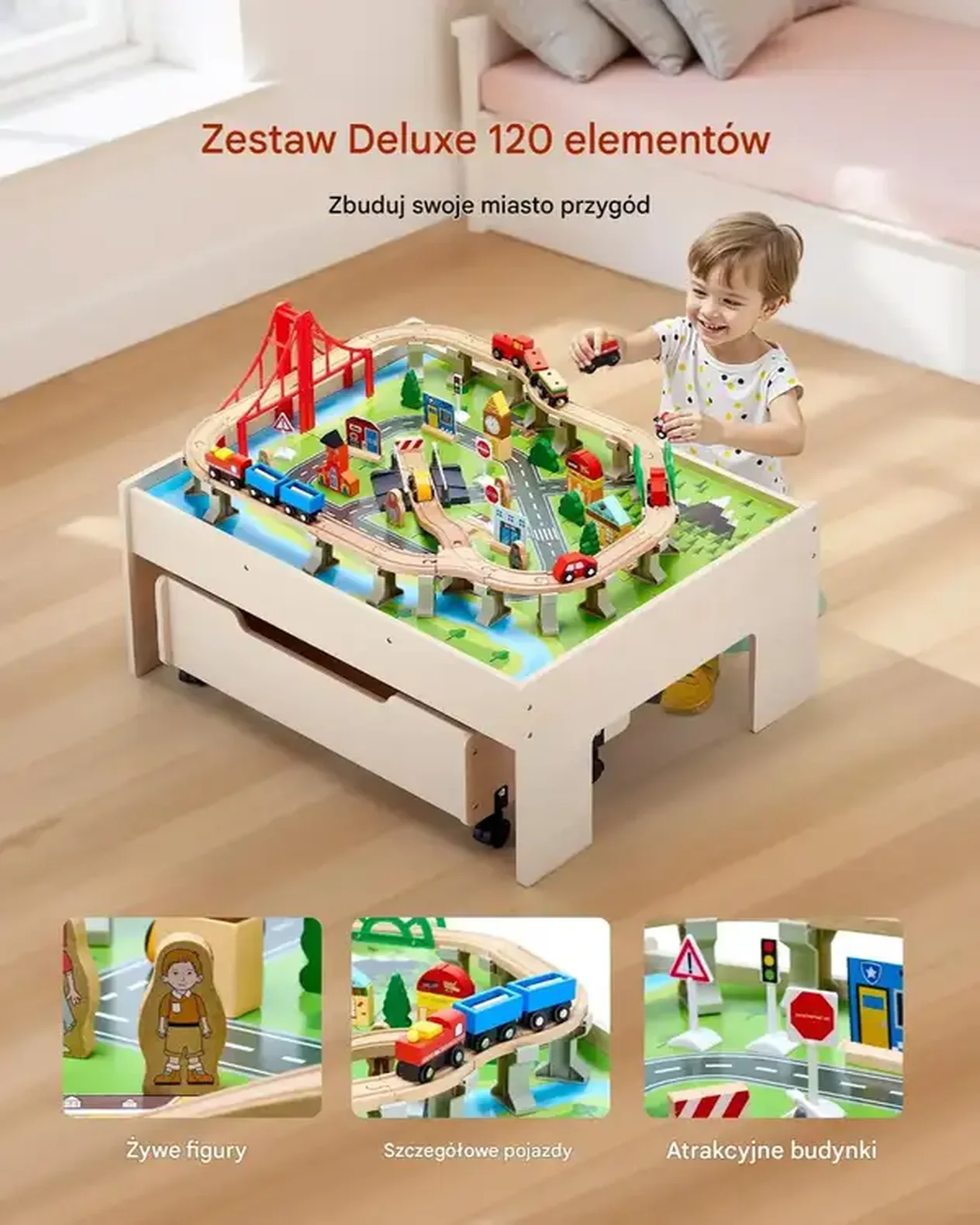 Stół do Zabawy z Pociągami – Drewniany Zestaw 100 Elementów dla Dzieci