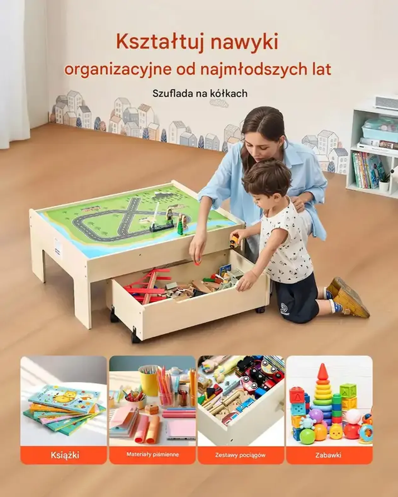 • Organizacja zabawek: Wbudowana szuflada umożliwia utrzymanie porządku i rozwija nawyki organizacyjne