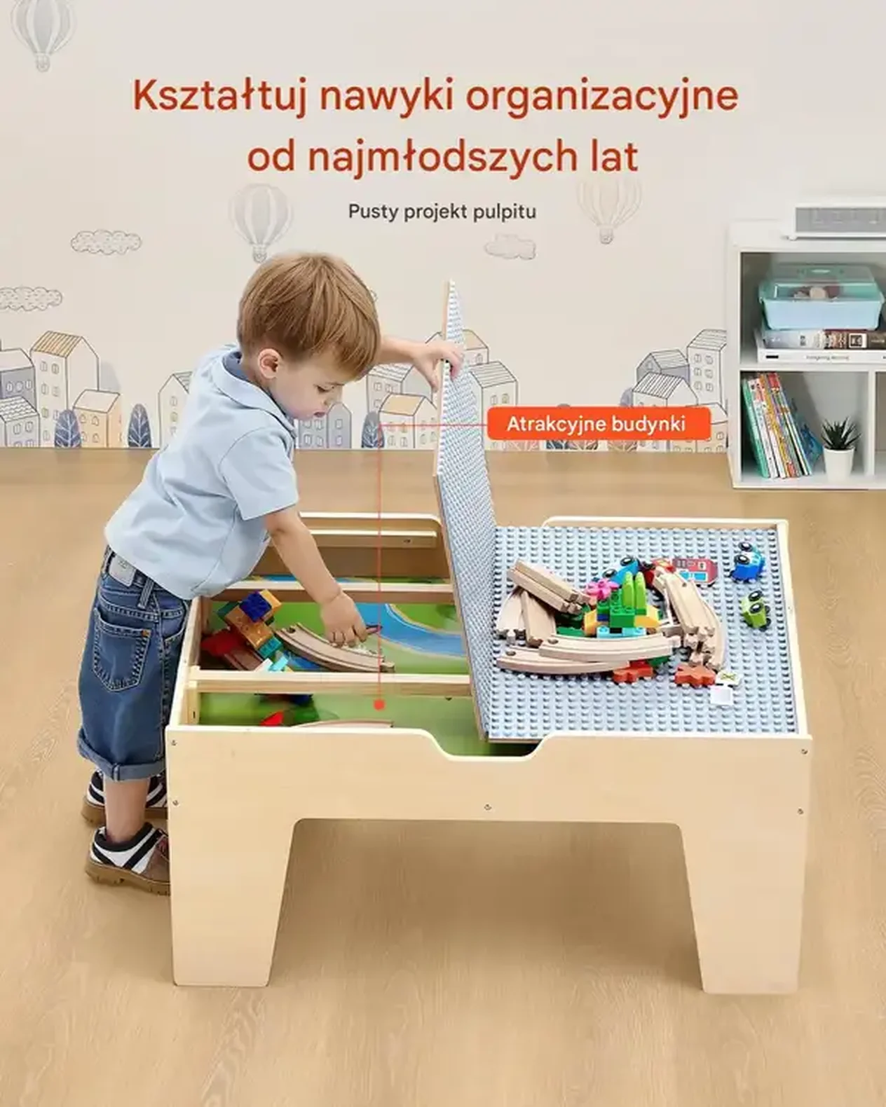 - ✅ Sprzyja organizacji: Pusty blat umożliwia przechowywanie klocków i akcesoriów, wspiera rozwijanie nawyków porządku
