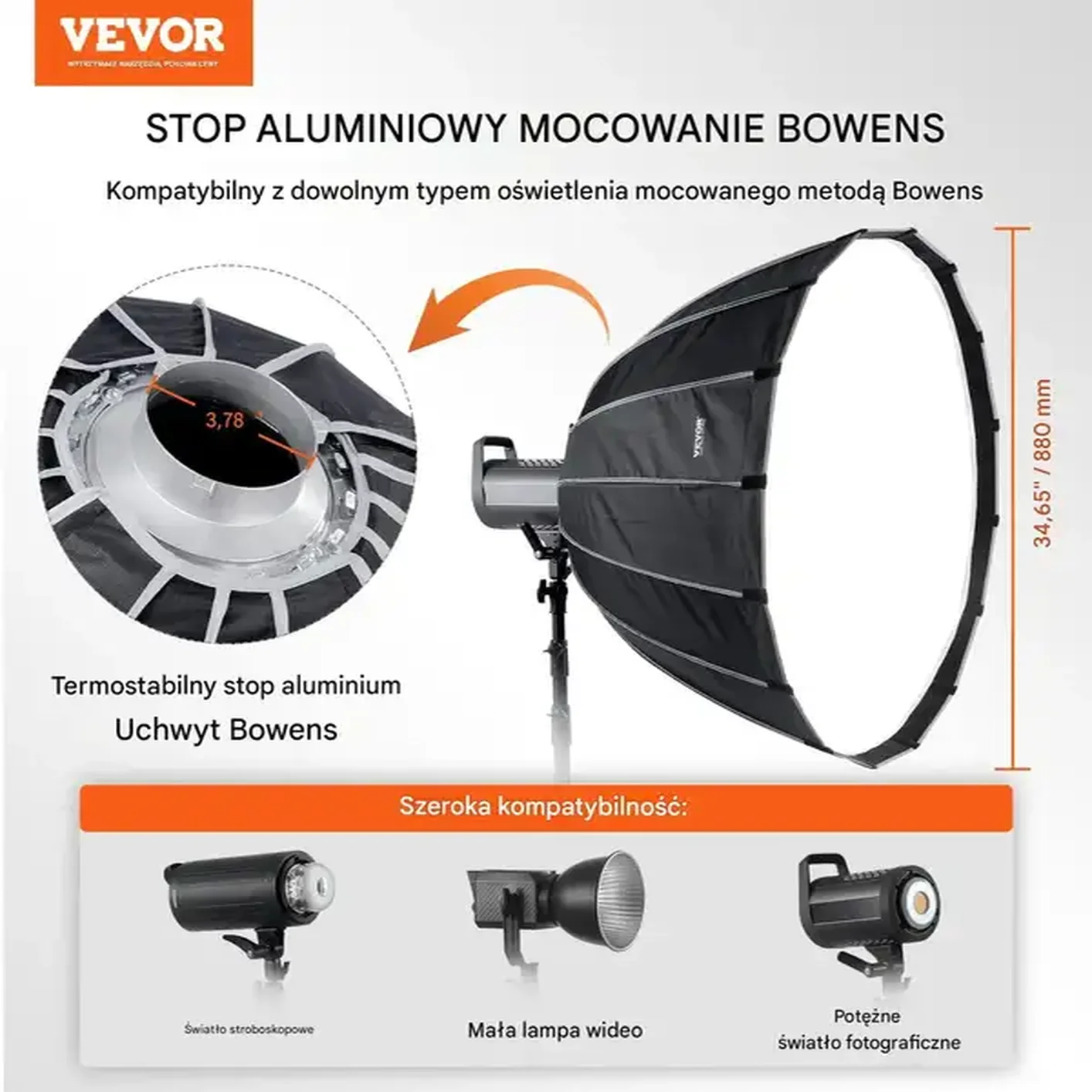 - Szeroka kompatybilność ➡️ mocowanie Bowens 96 mm / 3,78” pasuje do lamp błyskowych, LED i innych źródeł światła.